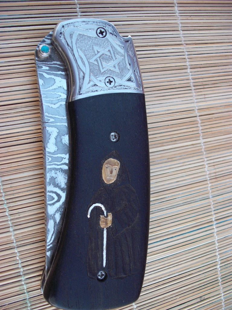 Можно спорить о концепции этого ножа и о национальной принадлежности пилигрима , изображенного на нем ( учитывая пристрастие Руди ко всему японскому, мне скорее видится синтоист , отправившийся в Нару :D ) , но в руке нож очень приятен .
