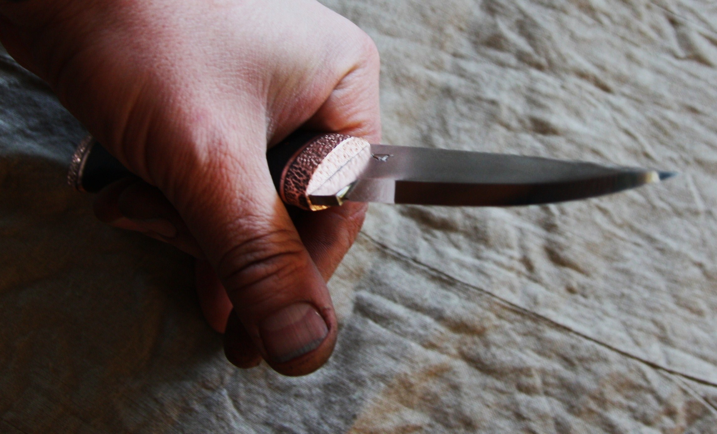 Хоть частенько и критикуют " оспины " на ножах Александра, но считаю, что на данном ноже и при данных материалах, они в тему. Нож красив и лаконичен. И хоть Артёму " хохлома " не глянулась, по мне так не пёстро. Клин хороший, но мне больше нравятся клинки от Эклунда, более покатый носик. В обшем, респект мастеру.