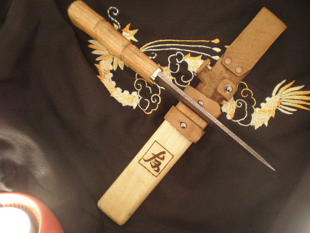 Нож заказной по имени Друг (Томо). Клинок работы Федотова. Рукоять вишня, больстер латунь, саи (ножны) - абаши, вставка-куриката вишня. Подвес съемный, кожа.