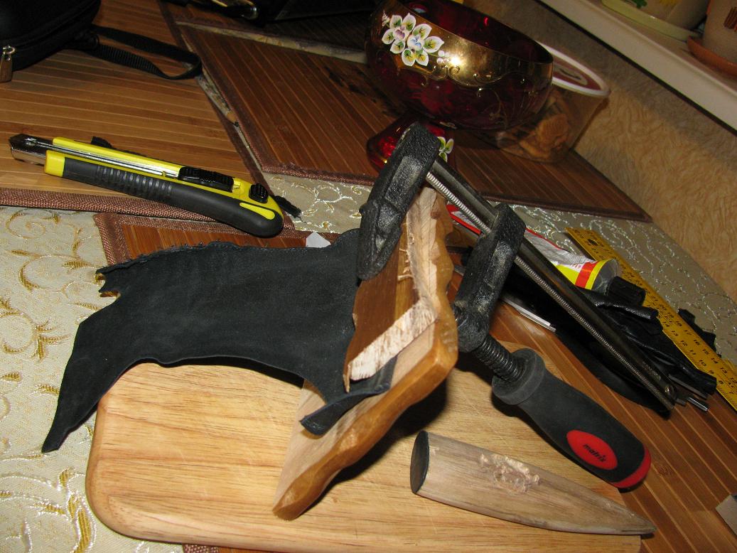 Дримелем выбираю пазы для инкрустации. Дальше работа с кожей. Клею устье, излишки обрезаю. Край кожи подгибаю, сажаю на клей