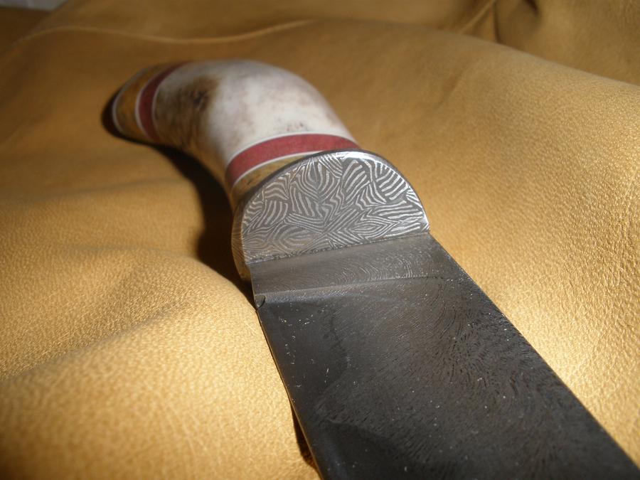 Приветствую уважаемое сообщество.Попробую показать Вам свою недавнюю работу.Всё до нельзя элементарное-железки, деревяшки ,рогалик.Клин и рукоять по 115 мм ,ширина клинка 26 мм,толщина в обухе 3.5 мм .Габарит рукояти толщина в самом серединном месте 25мм и ширина 30 мм.Глубина боковой подпальцевой выемки 7 мм . Нож не заточен.Монтаж клинка стяжной ,дамасковый тыльник является гайкой.На клинке мастерской Федотова ламинат ,сердцевина У8,обкладки раскованый трос.Фурнитура из дамаска той же фирмы.Кроме рога оленя в рукояти стоят вставки стабилизированного и крашеного кленового капа.(и совсем для разделения цветов пластиковые карточки).В общем как-то так .Табуретки из дорогих пород дерева пущу в дело,красивые тапочки оставлю себе.