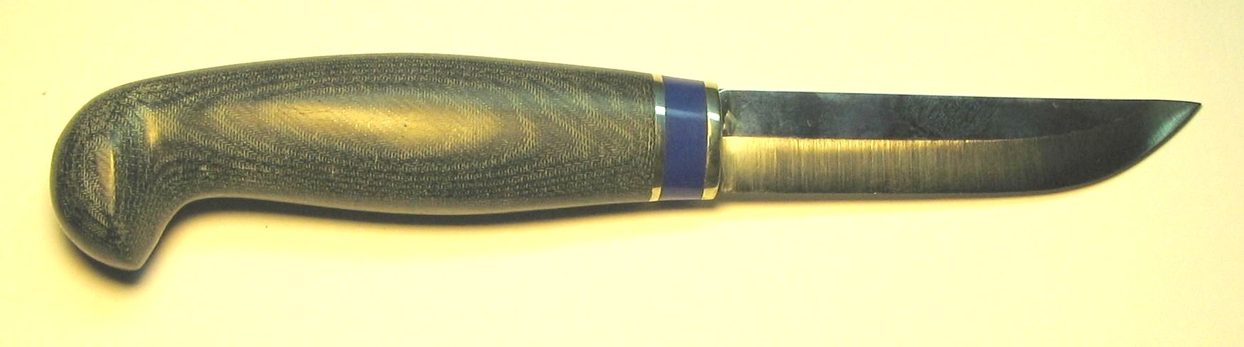 Я еще не делал ножикофф с клинком Лаури. И вот решил восполнить пробел - одеть клинок в самопальную микарту. Нарезал джинсы полосками. Но не стал наматывать их, а действовал испытанным способом - сложил стопкой. Получилось 32 слоя. Намазал, сжал и когда проклеилось осталось только убрать лишнее. Получилась финочка не боящаяся воды. :)