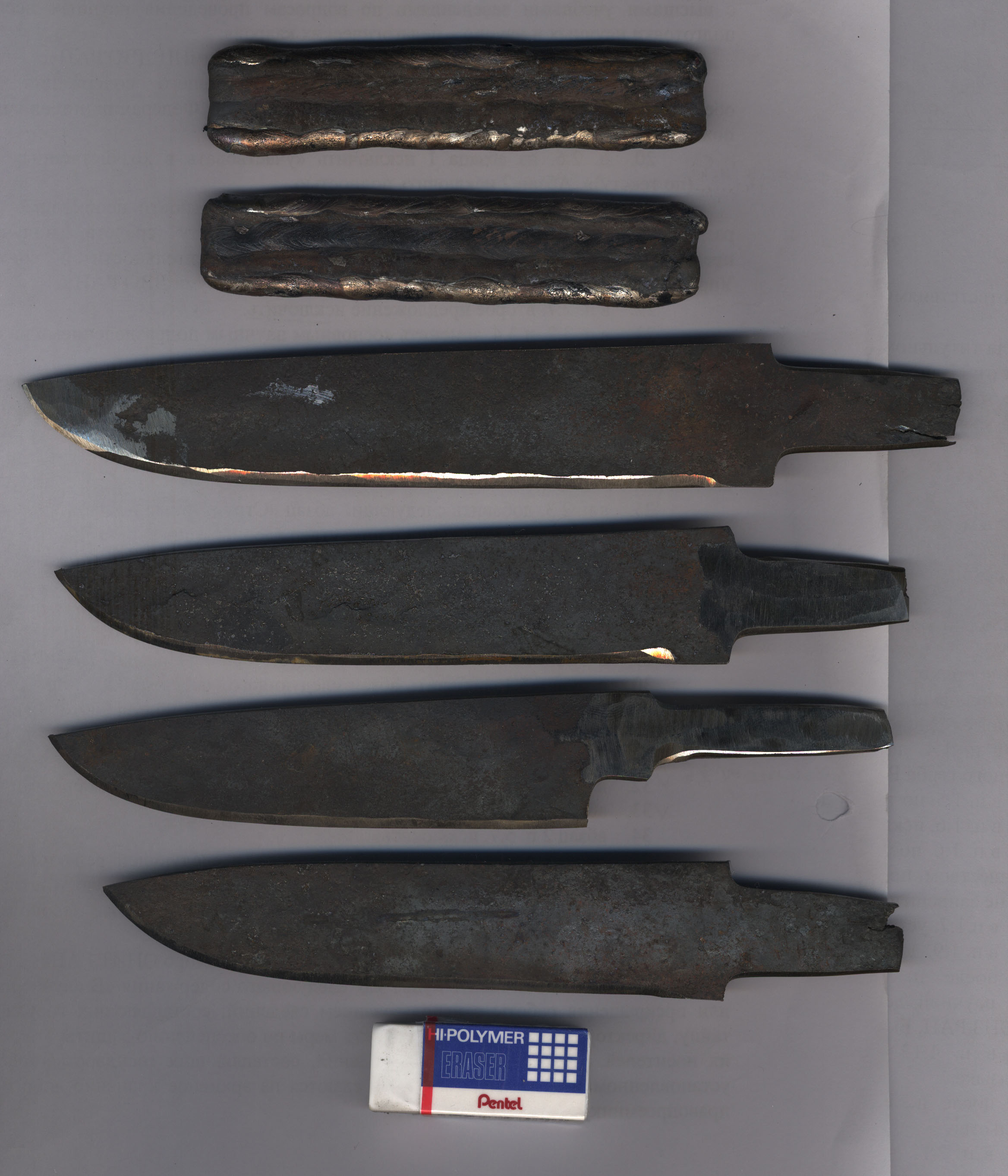 Пока на сканере, если не удовлетворит, перефотографирую. Сверху обваренная нержавейкой CPM35VN, исходный размер 100х4.7х18 мм, по толщине, обваренная - до 8 мм. Торцы тоже обвариваются, потом после оттягивании спусков, стачивается мм 5, чтоб обнажить внутренний слой. Снизу то, что из нее может получится. Это ДИ113, обваренная, раскованная + грубая слесарка. Потом приваривается хвостовик, до нужной длины. Размер резинки 41 мм