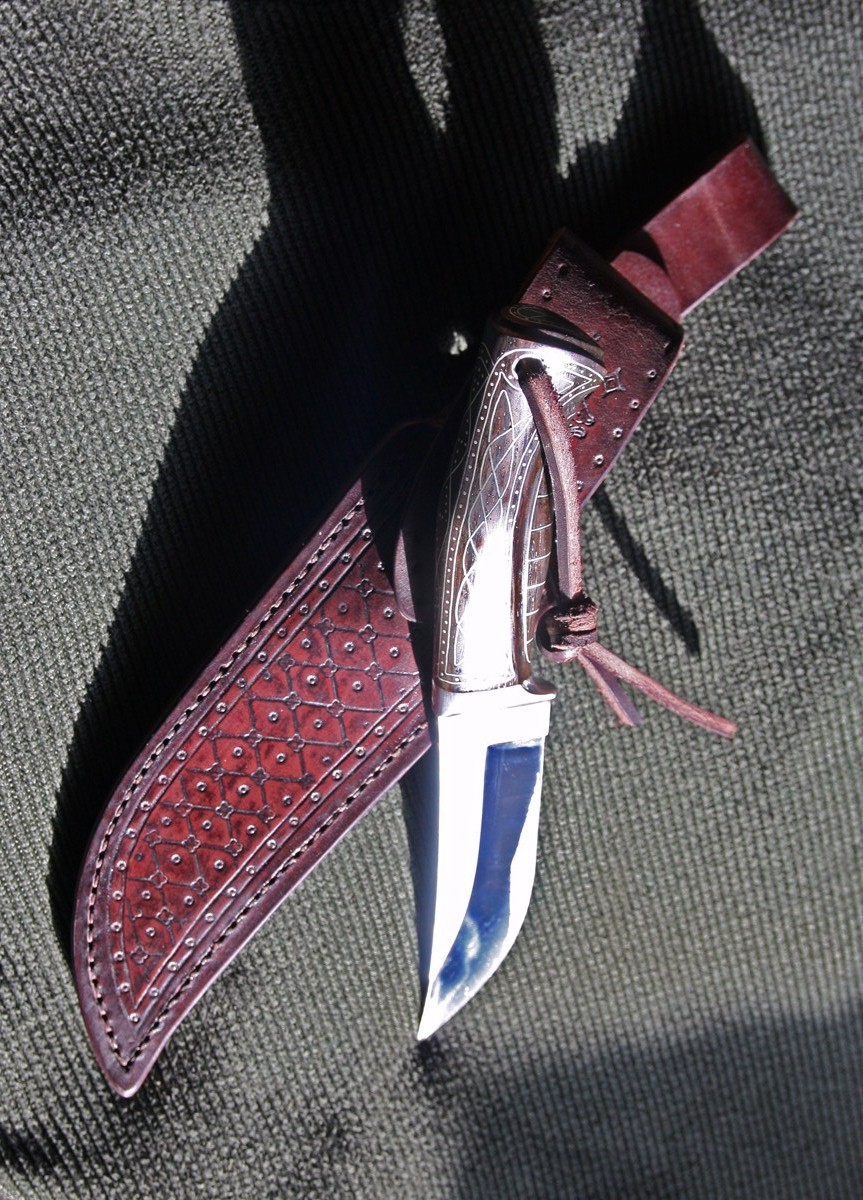 3. С орнаментацией ножен, на мой взгляд, опять перебор. Хватило бы узкого тиснения по периметру, а по центру ножен повторить бы плетенку, как на руковке.