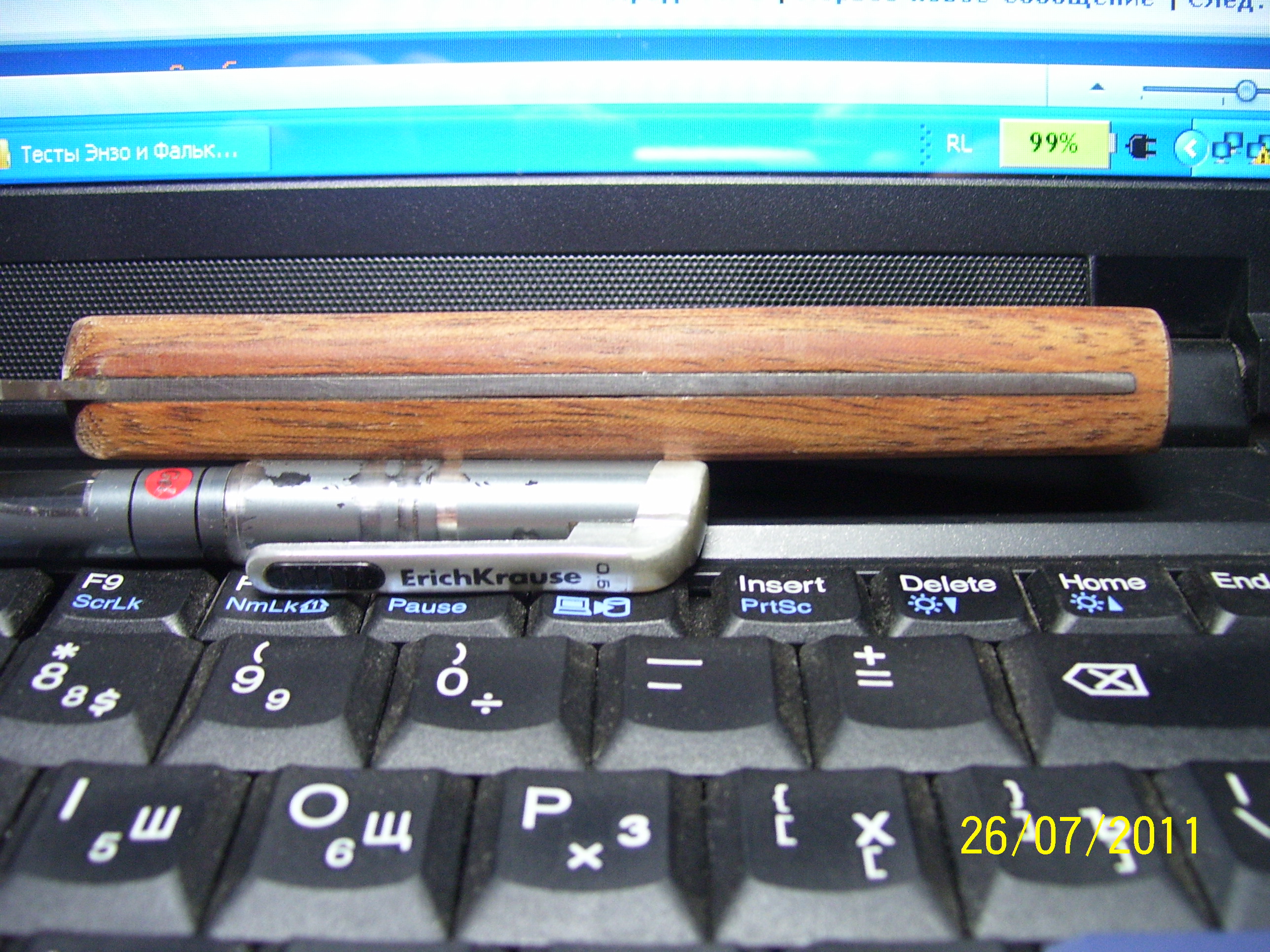 Всего на переточку ножа у меня ушло чуть больше часа с отвлеканиями по домашним делам. Но как нож точится...песня просто! Подводы к клинке отсутствуют, спуски в ноль, как у пчака. Неудивительно, что будучи тупым, нож продолжал резать. Монтаж клинка, обратите внимание, прост, со стороны вообще можно подумать, что клинок закреплен во временную оправку для каких-то тестов (мне всё тесты мерещатся :mrgreen: )