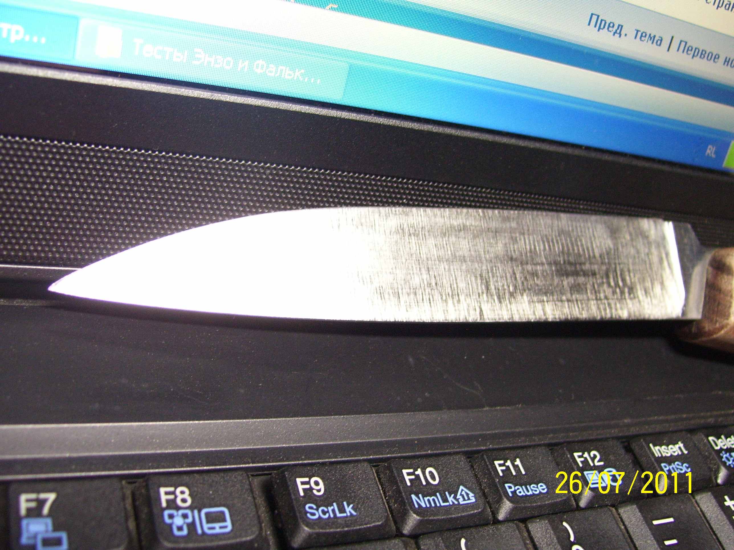Начал нож перетачивать, формировать ему новую РК. Точится с трудом, твердость, по ощущениям, близка к 59 единицам.