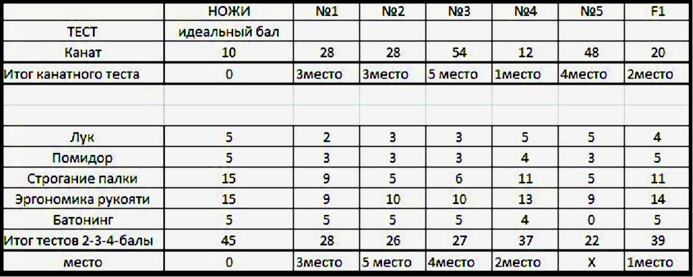 1 место- нож №4 (разница к идеалу 10 баллов)