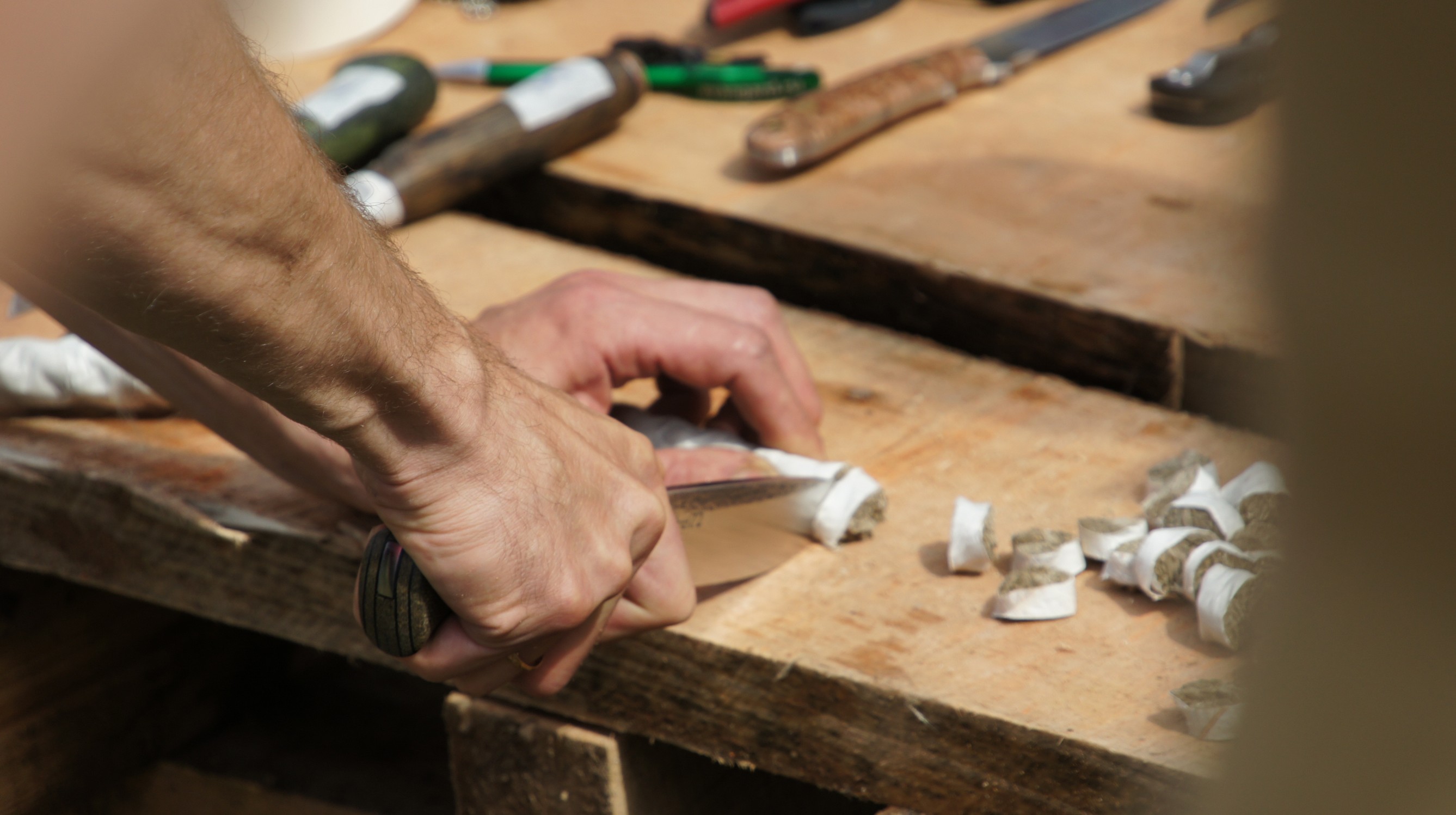 Кстати, помогите понять, по образу и подобию других тестов. После резки каната и перед строганием деревяхи правятся ли РК на ножах? Как это принято?
