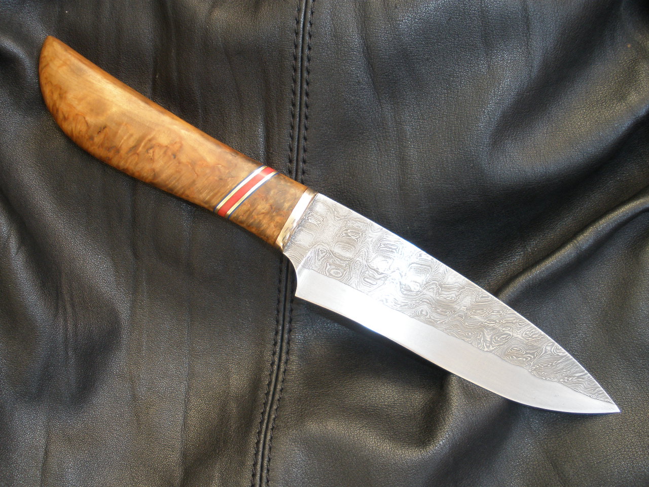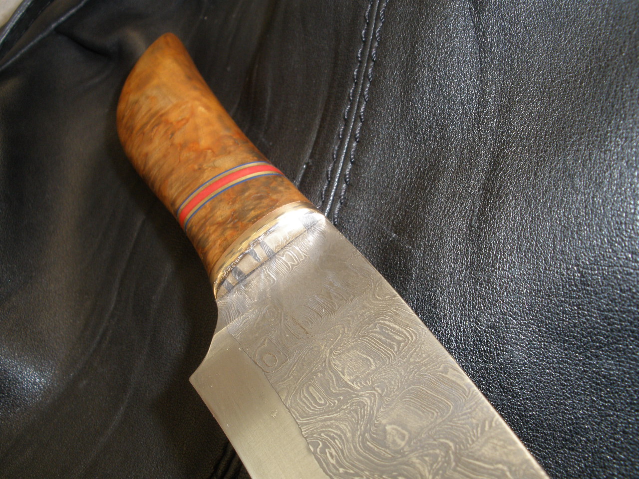 Приветствую сопалатников .. Вот сваялся ещё один нож для меня новой внешности.Размеры не самые редкие общ- 250 мм ,клинок - 128*35*2.4 ,рукоять-122 мм длины ,20 мм и 29 мм в широких местах, и 23мм и 13 мм в тонком месте.Всадной, на ЭДП.Дамаск Мастерской Федотова,переслесарен мной ,макуме ,фибра и карелка набраны из остатков былой роскоши (из ящика с обрезками).Думаю что трудиться нож будет у кого-то на кухне (соответственно и ножен нет),хотя ему подвластна любая работа ,не связанная с поднятием тяжестей.В общем как-то так.