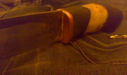 рукоять: медь, комль берёзы покрытый тушью, кап берёзовый, кожа, латунь. (еще не пропитана)
