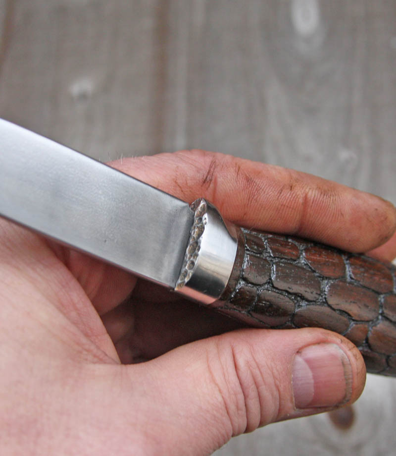 Черепаха - гуд! Кроме того, что хорошо выглядит, так ещё весьма практична, ИМХО. Ножег поменьше скользить будет в руке, но в то же время рельеф не такой сильный и равномерный, мозоли не набьёшь. А на счёт всечки... Понятно, что Ваши ножи, что хотите, то и делаете. Но вот зачем? Я повторюсь, что руками и ногами ЗА разного рода украшательства. Даже отдаю предпочтение именно украшенным ножам, более того, простые ножи-работяги мне не интересны, я люблю что-то ближе к АХХО или арту. Простых, скучных, рабочих ножей - миллионы. А художественных - единицы. Но я не понимаю, когда украшают рабочий нож. Рабочий нож должен быть прост, удобен, надёжен и именно скучен, ибо им надо работать, а не тратить время любуясь на него. Да и порой, украшенный нож просто жалко убивать по полной программе. О5 же, а если потеряешь или сломаешь? Потерял "одноликого работягу из толпы", и не жалко, за приемлемую сумму завтра купил нового. А нож со всечкой уже дороже стоит, и гораздо, да и продаётся не на каждом углу. Да дело даже не в цене, а в том, что красивую весчь жалко, а невзрачную чаще всего нет. Психология такая у большинства.