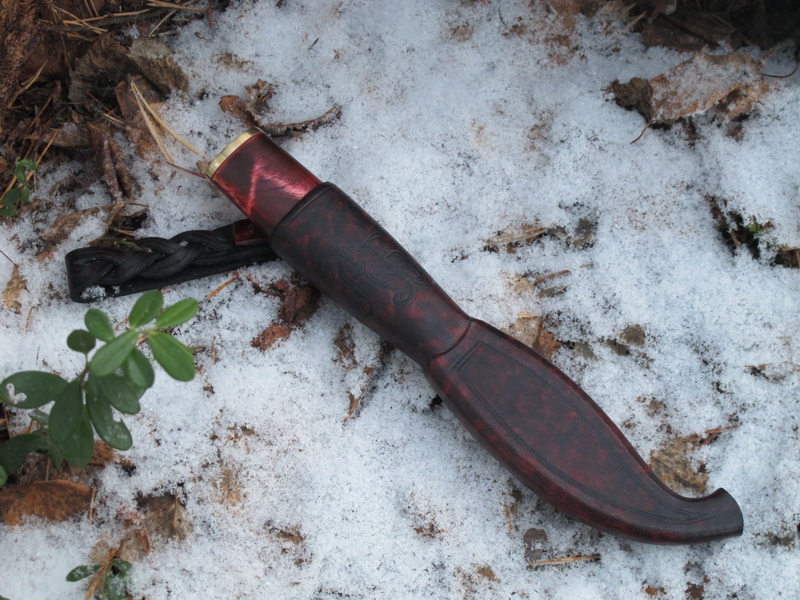 Рукоять из березовой сувели, тонировка черной и красной морилкой. Больстер и тыльник латунные, с дятлингом. Монтаж сквозной на расклеп с эпоксидкой. Размер рукояти 112х30х22мм. Масло для полок, даниш ойл.