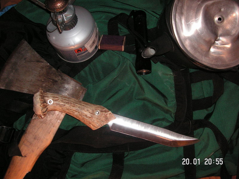 Несколько дней спустя, после прилюдного бритья ног, ко мне подошёл бригадир и спросил, могу ли я для него сделать нож? Он нарисовал мне эскиз, дал рихтовочную пилу и лосиный рог. Бригадир хотел монтировать клинок с рукоятью по методу пластинчатого монтажа, но я его отговорил. Дело в том, что рихтовочные пилы имеют свойство ржаветь и если часть хвостовика осталась бы снаружи мы бы подвергли ржавлению весь хвостовик. И я убедил бригадира делать всадной монтаж. Первым делом я ободрал на наждаке боковые грани пилы. После стал шлифовать их на шлиф. машинке. Вначале шкуркой на 60 единиц, потом 80, 100, 120 и 150. Рисок от шкурки на 150 единиц уже не оставалось. Старые опытные работники сказали, что это от того, что у станка скорость высокая, а если шлифовать вручную, то результат будет. Но таким извратом я уже заниматься не стал. Я придал пиле форму и на наждаке вывел спуски. Хоть и точил их на камне большого диаметра, они всё равно получились вогнутыми. Бригадиру это не понравилось. « Хочу» , говорит, «прямые, плоские» . Так что пришлось спуски стачивать на шлиф. машине. Результат – прямые, плоские спуски. Так же бригадиру не понравился плавный полукруглый подъём к обуху. Пришлось его переделывать. В результате – рк от чоила идёт прямо, затем немного закругляется вверх и дальше снова идёт прямо до самого обуха.