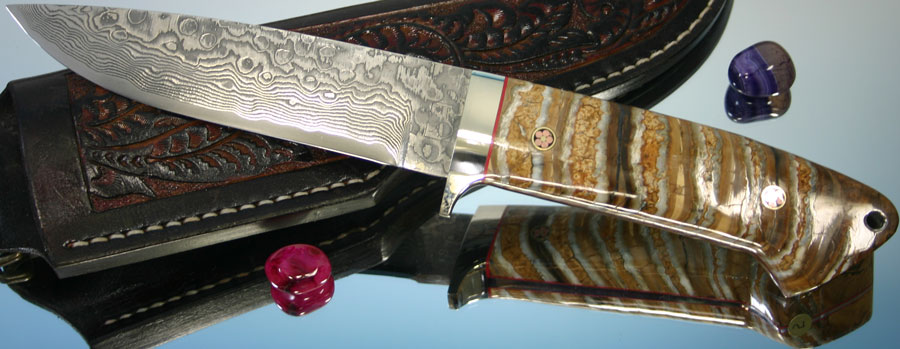5-1/2" Drop point R2 Damascus blade with 5-1/8" Mammoth Molar Tooth Handle with lanyard hole on end.