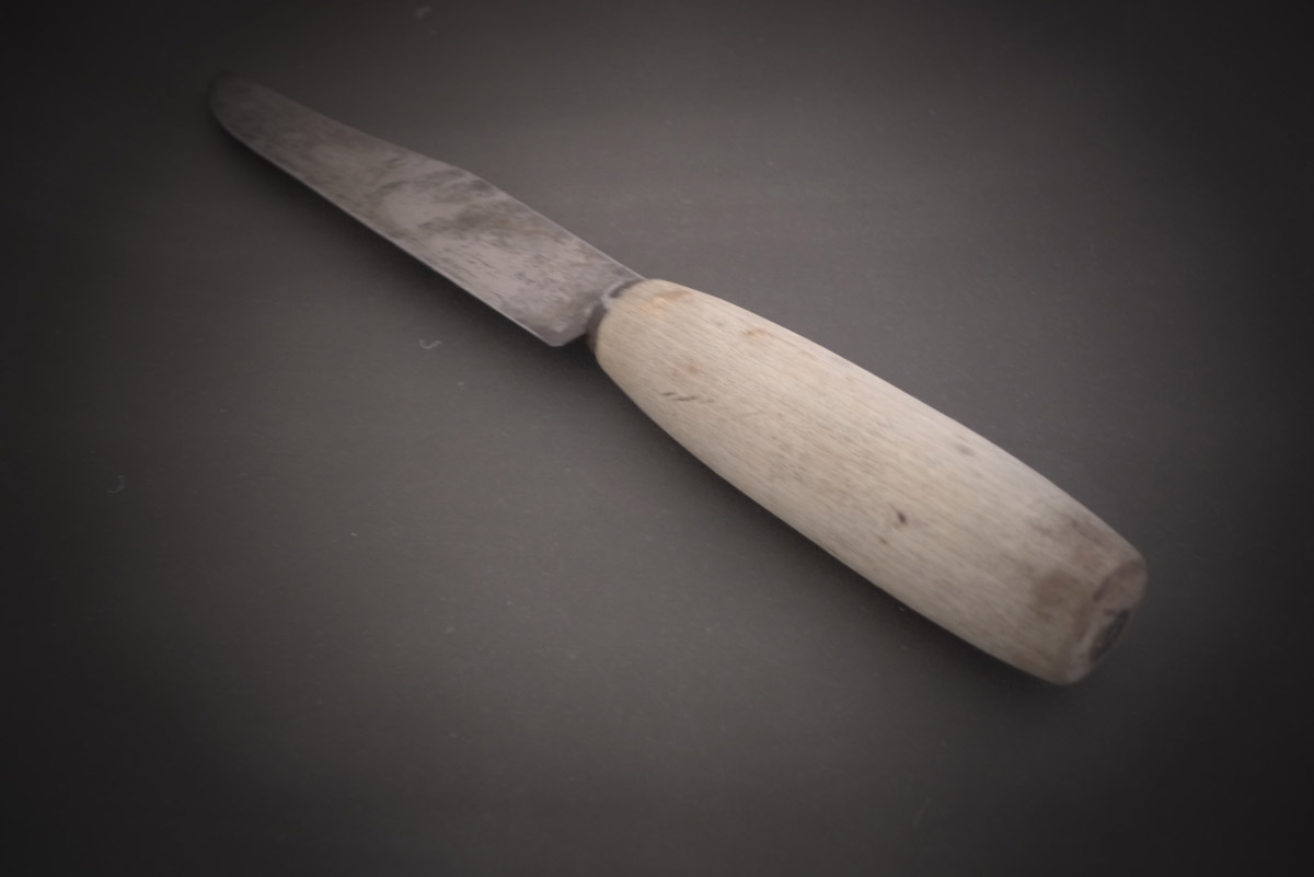 История этого ножа мне неизвестна, он был найден на даче среди инструментов тестя, и хотя он был весь в извёстке, по всей видимости использовали его при ремонте, взяв в руки этот нож на меня нахлынули былые воспоминания.