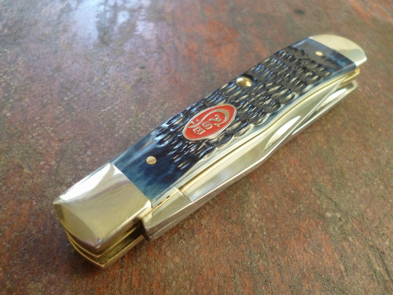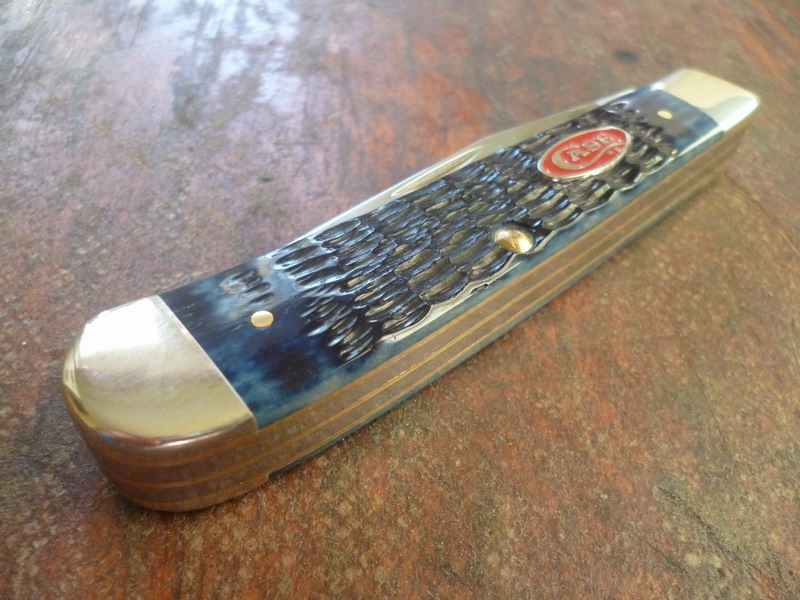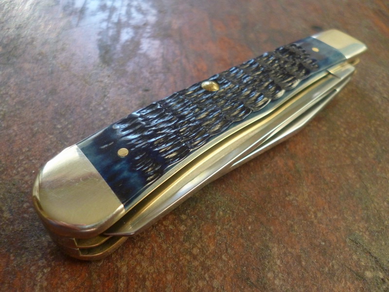 Два клинка из нержавеющей стали, она же хирургическая, она же SS. На самом деле, скорее всего 420 сталь или её разновидность. Один клинок формы Боуи с слегка вогнутыми спусками от обуха. Второй клинок в форме Спей с теми же самыми слегка вогнутыми спусками от обуха. Оба клинка открываются с помощью ногтевых дольцев. У каждого клинка своя собственная стальная пружина. Между ними латунная проставка. Плашки тоже латунные, как и клёпки. Притины из мельхиора, а накладки из коровьей берцовой кости голубого цвета.