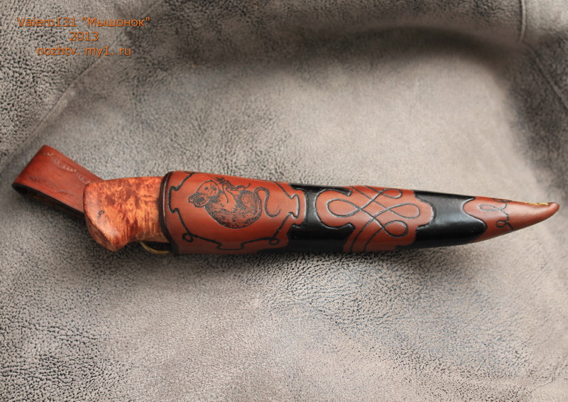 Ножны: телячья кожа, выжигание, краска «саламандер», вощёная нить, обувной воск, вкладыш пвх, латунное полукольцо.