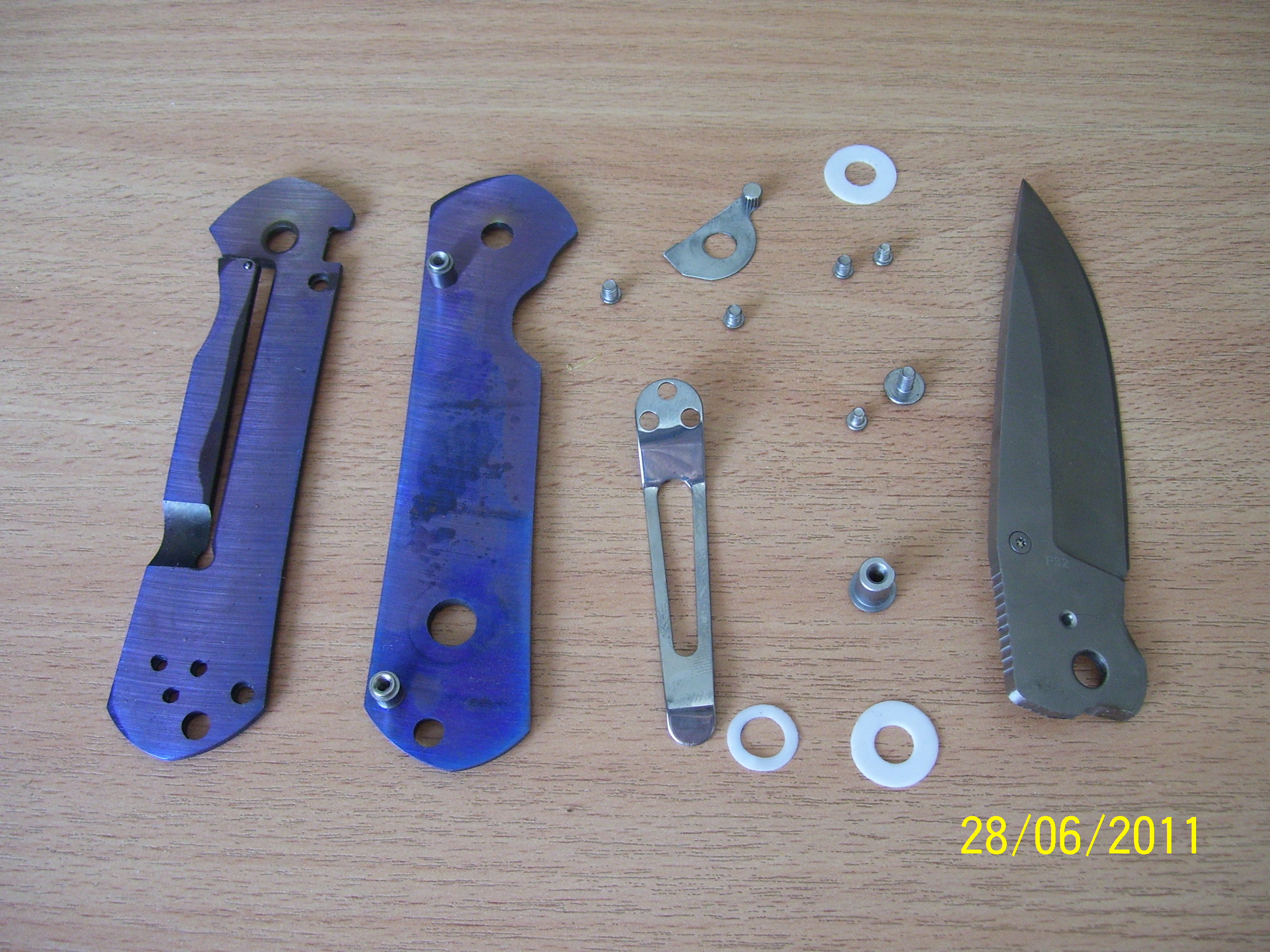 Крутил-вертел я в руках этот тяжеленький клон в поисках косячков и вскоре нашёл. Клинок был слегка не по центру, да и открывался-закрывался фолдер с каким-то незначительным затруднением. Ага...где там мои торксы? Сходил на лоджию, принёс инструмент, разобрал фолдер. Разобрал очень быстро. Винты все отвернулись сразу, дурацких усилий прилагать не пришлось (помнится, когда разбирал Лэнды, матерился, на них все винты были затянуты намертво). Так, поглядим, что тут у нас есть...винты не сырые, нормальные, плашки изнутри какие-то синие...скорее всего, гальваническое покрытие. Шайбы фторопластовые, причем их три :shock: Ага, пытались выровнять клинок по центру, поэтому с одной стороны их 2, а с другой-одна. И ещё один внутренний открывшийся косячок-осевая втулка имеет шлифованную лыску с одной стороны. Если фотку кликнуть, то её можно рассмотреть. Зачем она тут? Вот именно, незачем. На оси нет ни одной детали, которая имела бы такой же ответный элемент. Я решил, что втулку поставили от другого ножа, похожую по размерам и по диаметру.