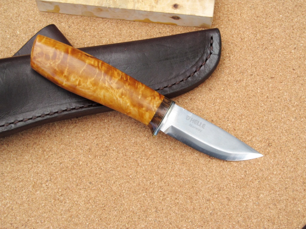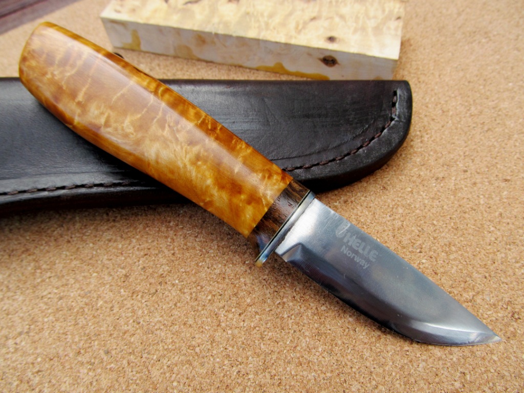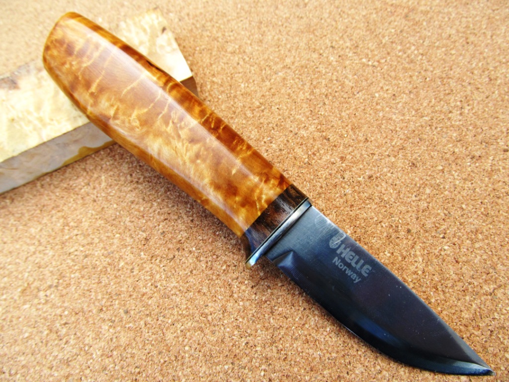 Что бы исправить впечатление, что я на этот форум только ради трепа захожу, выкладываю несколько ножиков что я настрогал за последние месяца три-четыре. Этот только что закончил - сделал на этой неделе. Мелкий клинок от Хелле: заказал в свое время по интернету исключительно за то, что было написано, типа, ламинат из углеродки. Я углеродку в целом уважаю, так что на размеры особо и не смотрел. А размеры скромные - всего длинна-то миллиметров 70 наверное. Ну и, поскольку, радмер не мой любимый, сам Хелле легко царапается и от жадности в целом, пустил на рукоять я кусок карелки из пары на накладки: продавец в свое время имел смутное представление о необходимой толщине материала на рукояти - купил я у него тогда и вот эти супер-толстые накладки, и мелковатые по-хорошему бруски на рукояти. Но материал первоклассный - только в данном случае весьма неоднородный. Рядом лежит вторая "накладка" из пары: для накладки толсто, для рукояти: очень тонко. Но я решил: если не смогу хорошо просверлить - не велика потеря. Смог. Короче: фотки что есть: