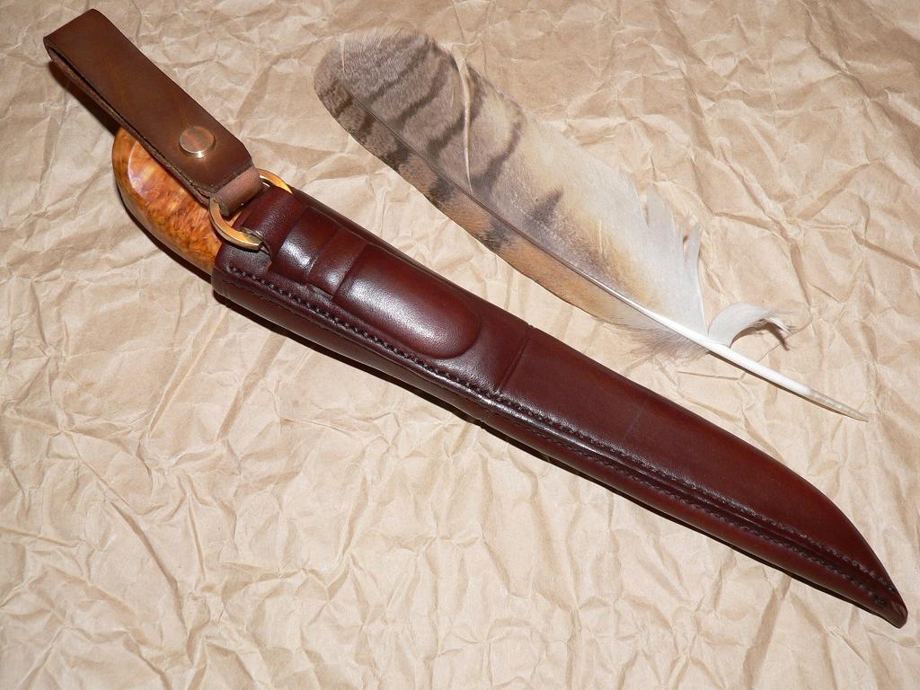 Теперь что получилось в итоге: клинок Лаури-дроп нержа 80 мм. рукоять - лосик , сувель березы 120 мм. пропитка - яхтный лак, финиш даниш, полировка. Ножны - кожа чепрак, пропитаны смесью восков. Фото