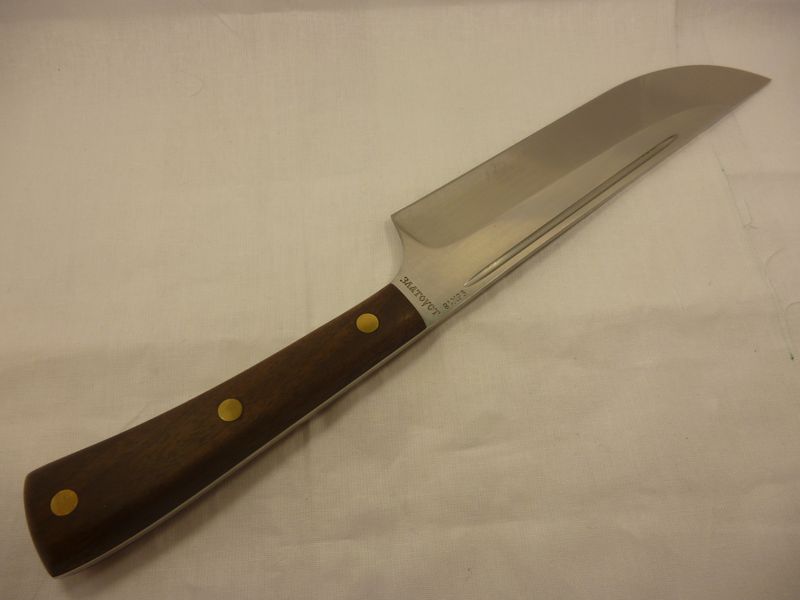Весной 2013 на выставке у ребят с АиРа купил нож «Пчак Н». Стал пользовать его на кухне и сразу или почти сразу появилось желание переделать нож. Сначала не понравилась родная заточка. Начал перетачивать клинок и выяснилось, что у него S-образная РК. Специально это было сделано на заводе или нечаянно, но теперь РК прямая. Затем я сточил пяту клинка, и резать, и точит нож стало гораздо удобней. Вздернутый кончик клинка я долго терпел. Всё ждал, когда он мне откроет свой тайный смысл, но не найдя ему применения, и не научившись его как следует затачивать, я и его сточил. Теперь у ножа стал прямой обух. Дольше всех я терпел рукоять, всё надеялся, что привыкну к ней, но, увы и ах… Я понял, что когда толщина рукояти больше ширины, мне очень неудобно – это не моё. Когда грибок рукояти кухонного ножа слишком массивен, мне не комфортно, особенно мизинцу – это тоже не моё. Когда углы и грани на рукояти не сглажены, мне сложно управляться таким ножом – это вовсе не моё. Рукоять была безжалостно обточена именно в таком порядке, вначале убрал толщину, затем грибок, ну а потом скруглил грани. Все переделки делал постепенно, в течение года, ножом постоянно пользовался на кухне. Сейчас, в новом обличье, нож трудится на кухне уже полгода – полёт нормальный.