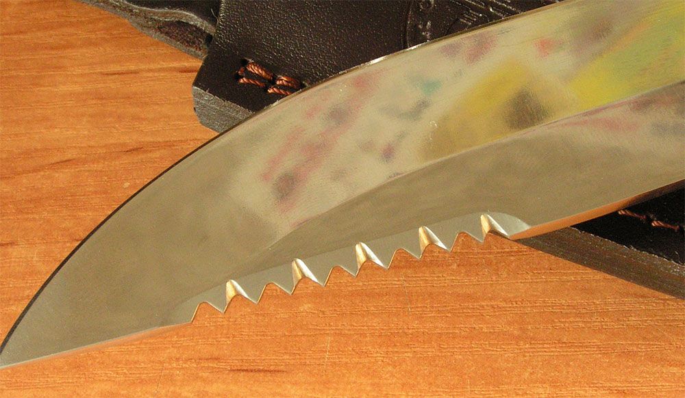 Конечно в любом положительном моменте в жизни есть свои "но". Вот и в этом первом нормальном ноже они есть. Я всегда любил ножи с пилами - аля Рэмбо - типа круто это, но поюзав стрельца в разделке мерзлого мяса понял - нафиг она там не нужна - пилить толком не пилит а вот при силовом резе с надавливанием в обух впивается очень чувствительно в ладонь... Говорят, этой пилой хорошо чешую снимать, но последнее время из рыбы у меня только калуга, а там это нафиг не надо - колючки её эта пила нифига не берёт, а чешуя там мелкая и снимать её не нужно... У нас, кстати, из за этих колючек калугу и осетра так и называют между собой - "колючка", "колючка пошла".