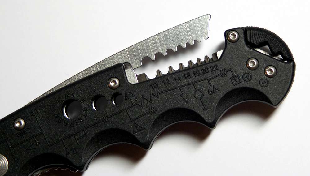 Три отверстия в рукояти сделаны так, что клинок в сложенном виде частично перекрывает их, позволяя зачищать пропущенные в отверстия провода большого диаметра. Провод сечением 8мм*2 был успешно зачищен.