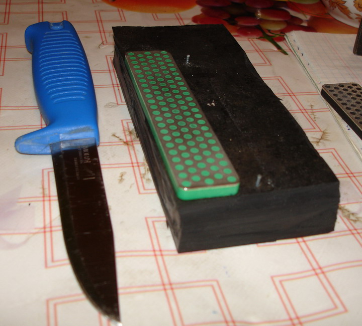 Решил сегодня воспользоватся доплнительными возможностями алмазных брусочков ДМТ.С задней стороны имются отверстия,для закрепления бруска.Сегодня мне свезло скомуниздить пару кусков толстой резины,и вот что из этого получилось: