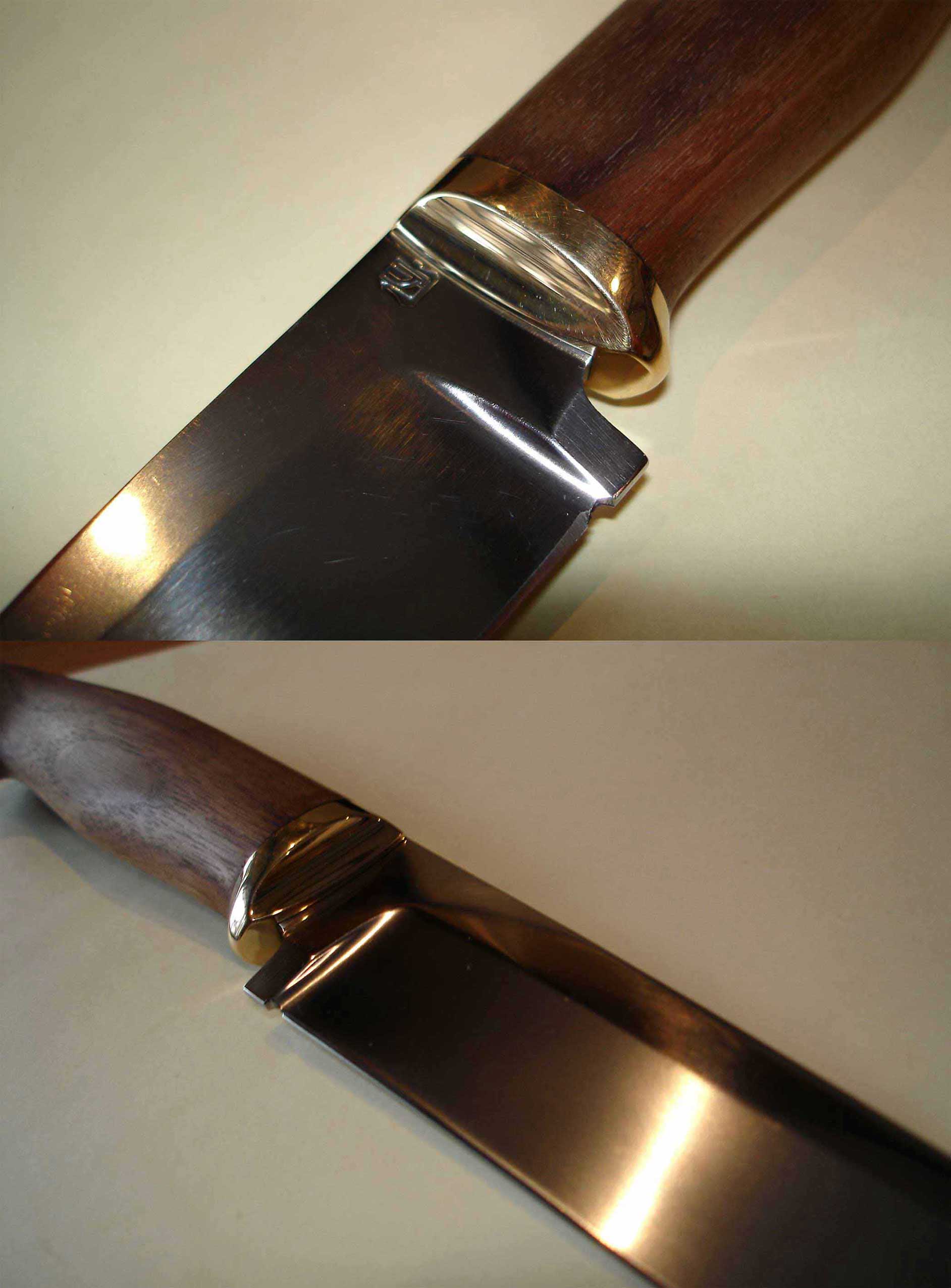 На его сайте увидел фото где показана конструкция сквозного монтажа и был очень сильно удивлен и огорчен. Неужели за те деньги что стоят его ножи нужно еще экономить на хвостовиках. Может быть он и гарантирует качество всех этих шпилек, заклепок или винтов которыми собирается этот псевдо-сквозной монтаж, но как-то не греет душу.