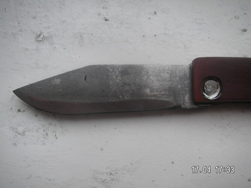 Увольнялся у нас как то слесарь – Серёга. И оставлял нам всё, что накопил за долгие годы работы. Мне достался его рабочий нож. Это было что-то несуразное. Я даже не понял, как этим резать. Закинул я его в верстак и забыл. А тут как то всё навалилось… Я больше года делал свой классический складень, и получилась не рабочая железяка. А Самоделкин, меньше чем за месяц, сделал рабочий тактик. Я решил больше никогда, а ребята на форуме говорят, давай ещё. Мне самому не понравилось то, что у меня вышло, а Прохор говорит – хочууу!!! Ну и заело меня, что я совсем безрукий, что я совсем не могу? Нашёл Серёгин нож, разобрал его. Надо написать из чего он был сделан. Плашки и пружина фиксатора, от какого-то складня. Клинок, от какого-то кухонника. А что бы клинок не складывался, и вместо накладок – километр изоленты. Я взял только плашки и пружину. Отрихтовал их, отверстия рассверлил на больший диаметр и шлифанул шкуркой. Так что сказать, что я сделал нож, будет не честно. Что-то я сделал, а что-то собрал.