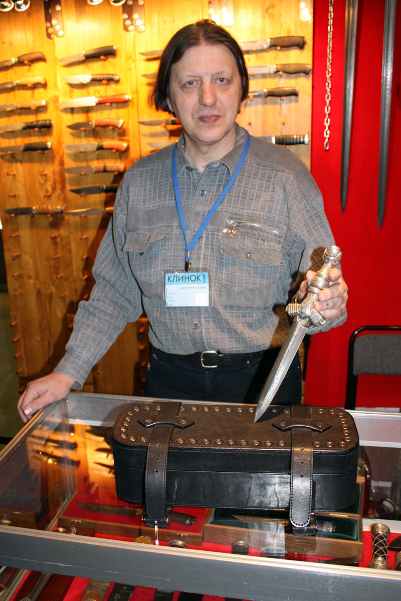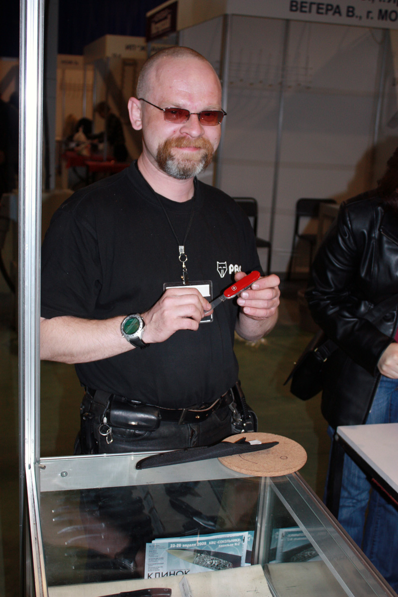 Продолжаем. Раз уж начал про Мастеров, то про них и продолжу. Архангельские, Мария и Леонид. Да я говорил, что я равнодушен к клинкам из узорчатой стали, но не пообщаться с такими мастерами я не мог. Леонида на стенде я не застал, зато поговорил с Марией. Разговор был примерно таким: Здравствуйте! Здравствуйте, проходите, смотрите, вот мы книгу выпустили, за 2 т. р. Продаём. А зачем у этой финки долы сделали? Это копия ножа разведчика 41 года. А долы та зачем? А вы вот книгу купите, там всё подробно написано. А научите меня на глаз отличать дамаск от булата. А этому в книге как раз целая глава посвящена. Слава богу подошёл какой то продвинутый ножеман и попросил показать складень с дамасским клинком. Складень оказался последней моделью от Широгорова с клинком от Архангельских. Я его хотел сфоткать вместе с Марией, но она не разрешила, поэтому я сфоткал только её руки с ножом. Кстати цена ножа была озвучена, но я не запомнил. Толи 35, то ли 55 т. р. Прохор обратил моё внимание на руки Марии и посоветовал сходить на стенд Натальи Забелиной. Я последовал его совету, и имел счастье лицезреть настоящие руки женщины – кузнеца. К слову сказать, мне её творчество не понравилось. Туристы как туристы, да ещё и клинки из узорчатой стали, короче не моё. Но сама Наталья и её подруга мне понравились, привлекательные, весёлые барышни. Встретил бы в городе, подумал бы студентки. Ну да что-то я отвлёкся. Мастера, надо сосредоточиться на мастерах. Мастер Раков, мне не понравился. Ни он сам конечно, а его ножи. Мне показалось, что они какие то вычурные, можно сказать фантазийные. Кстати, с мастером Раковым связан один смешной эпизод. Когда организаторы приглашали участников выставки приносить свои творения на состязание – это звучало примерно так: просим участников приносить свои ножи на конкурс. Мастер Раков, просим приносить свои ножи на конкурс. Вот так, мастера выделили. Так же мне не понравилось творчество мастера Уракова. Ножей у него было мало, и все они были выполнены в азиатском стиле, не то в китайском, не то в японском. Я не говорю, что эти мастера делают плохие ножи, просто не моё. Естественно, я не мог не посетить стенд Геннадия Прокопенкова. Его самого я так и не увидел. За него была какая то женщина, всего с 4 ножами от мастера. 2 ёжика и 2 универсальных кухонника. На вопрос, что так мало, ответила, была ещё поварская тройка, но её ещё вчера кто то из организаторов купил, я даже распаковать не успела. Ёжики оказались из Х12МФ, слава Богу никто мне не рассказывал сказки про волновую сталь, с особым травлением, и как мне показалось тонковатыми рукоятями. Оба ножа комплектовались кожаными ножнами, сшитыми на заказ. Цена вопроса 15 т. р., но без особого травления и ножен. Кухонные универсалы, уже были без травления и ножен. Лежали и просили за себя, что-то около 7 – 8 т. р. Надо с мастерами завязывать. Кто у меня в памяти остался. НОКС, Шокуров, Широгоров и Чебурков. На стенде НОКСа я ничего интересного не нашёл. Попросил Прохора показать ножи которыми их на работе снабжали. Бедный Прохор, ради меня, весь стенд облазил, но искомые модели так и не нашёл. Шокуров встал со своим творчеством аккурат между ещё двумя кузнецами, и было трудно понять, где кончаются ножи Шокурова и начинаются ножи другого кузнеца. Нет, если бы я был поклонником его творчества, я конечно отличил бы руку мастера, а т