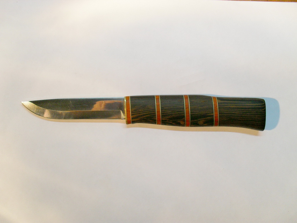 На глаза попалось льняное масло, и идея родилась сама собой: устроил водяную баню, в подходящую баночку опустил рукоять и поставил вариться (точнее – вымачиваться при температуре около 100С) на несколько часов. Масло давало довольно резкий амбре, причём явно на любителя – задействовал вытяжку, стало полегче. Сколько надо проводить такую процедуру – я не знал, и закончил часа через 3-4. Дерево немного потемнело (не очень равномерно). Т.к. эксперименты по вымачиванию ножа в воде в течении ночи были домашним строго запрещены, результаты пропитки остались для меня во многом неизвестны. И, для верности, я решил пропитать рукоять ещё и воском. Сказано – сделано: добыты церковные свечи, но тут… запах у них, как вы понимаете, специфический. Да и вообще, строго говоря, - неизвестно, только ли они из воска. Я уже молчу об этических соображениях. Тогда в ближайшем ларьке с вывеской «МЁД» был приобретён брусок воска, грамм 150. В тот же день он был расплавлен на водяной бане, и рукоять оказалась в жидком воске. Т.к. я понятия не имел – сколько нужно её там мытарить, было решено действовать в несколько приёмов, общей продолжительностью часов 5-7. Осмотр дерева после промежуточного этапа мало что дал – пропиталась, да, но что является целью? Как должно выглядеть дерево? Должна ли быть явно видимая плёнка? Вопросов было много, и рукоять отправилась париться дальше. К тому же, почему-то с одной стороны рукояти покрытие получилось гораздо более «жирное» на вид и на ощупь (нож вываривался в вертикальном положении). Было решено чередовать восковую баню и просушку ножа на батарее. Но вопрос, сколько, собственно, его надо высушивать – снова был открыт. Решил положиться на свои визуальные оценки. Визуальные оценки мало что дали :wink: , тогда, подсушив рукоять на батарее, и дав ножу остыть при комнатной температуре, отправил его в морозилку, для сушки. Сначала – на 5 минут. Затем – в воск, пузырьков (которые я рассматривал как косвенный признак того, что рукоять продолжает пропитываться) уже было гораздо меньше. Через некоторое время, когда их (пузырьков) стало совсем мало, операция «батарея-комната-морозилка» повторилась. На этот раз было решено поморозить подольше. Затем – опять в воск. Пузырьков поначалу вообще не было, а на рукояти образовался слой воска – «сконденсировался». Через некоторое время «конденсат» растворился, но пузырьков почти что не было. Подума, что кашу маслом, т.е. воском, не испортишь, подождал, поварил ещё – пузырьки так и не появились. Для пущей верности было решено повторить эрзац-сушку и квази-заморозку ещё раз. Пузырьки уже не появлялись вовсе, и я счёл пропитку законченной.