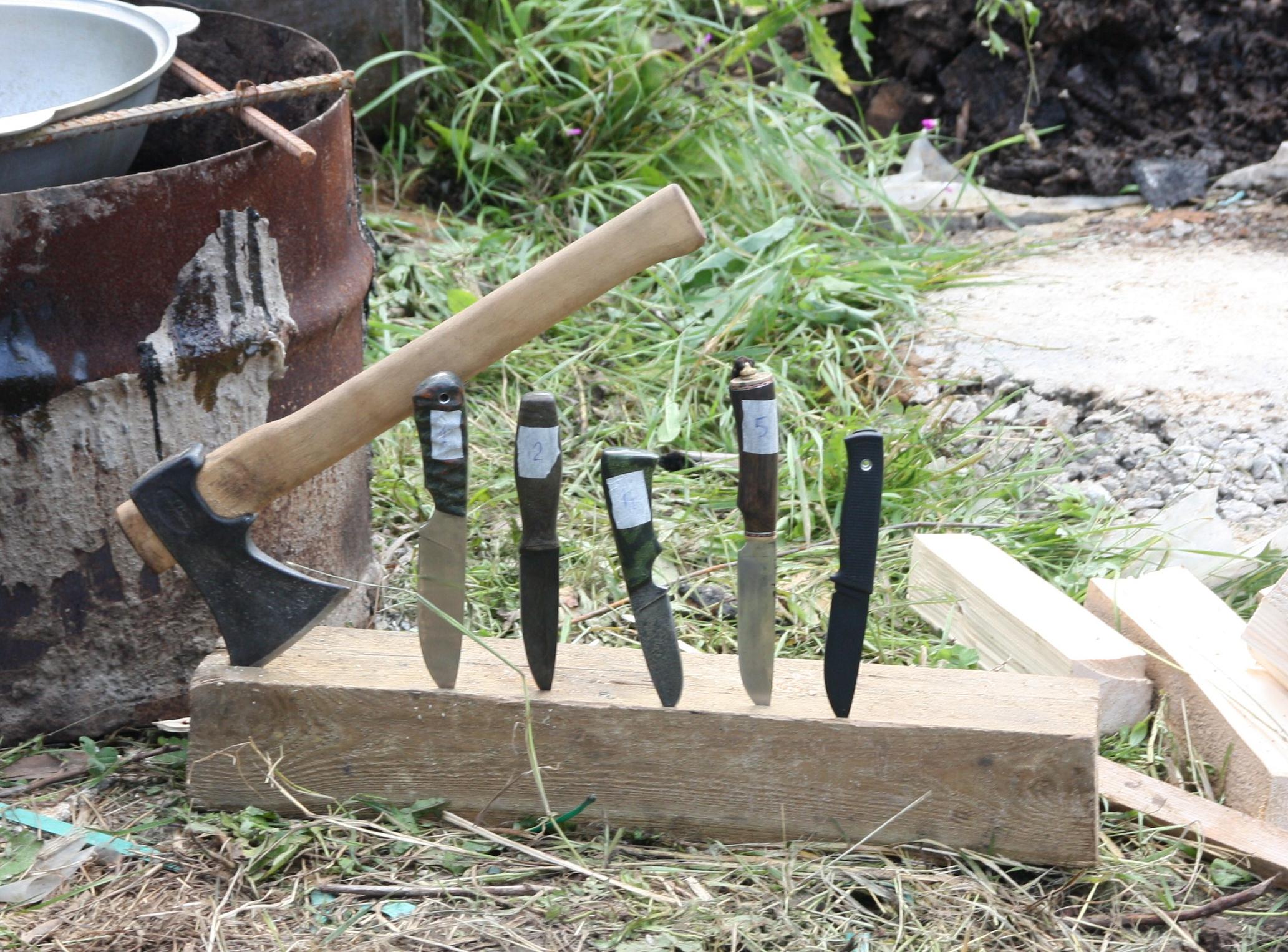 Основные ножи в забеге были пронумерованы, кроме эталонного фалька, и прошли состязание в многоборье...а именно.