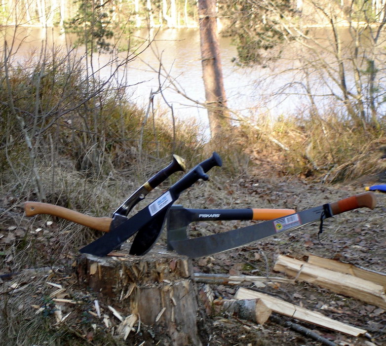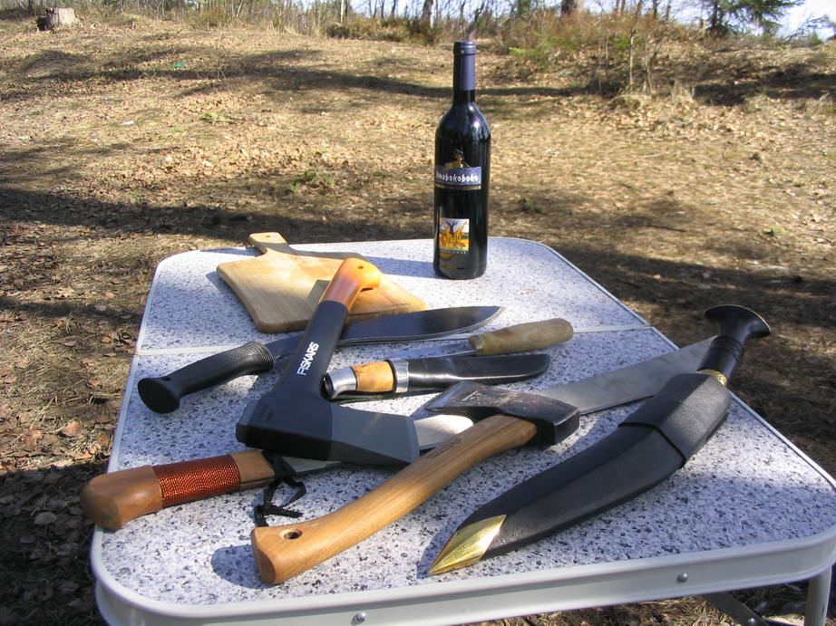 Кукри и мачетины вообще не проперли. Родная кукря кривая, больно отбивает при ударе, и, главное, навершием в кисть упирается, а колд стиловские и трамонтиновская - больно тонкие, нафига в северном лесу нужны - непонятно.