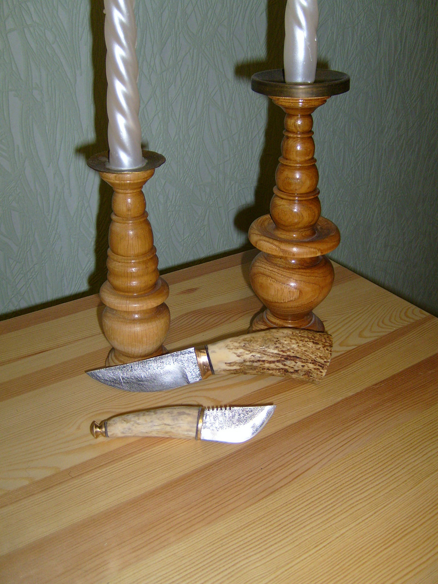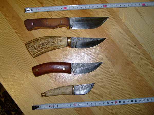 Все ножи из Р6М5 или HSS,рукояти(на первом фото, сверху вниз) - текстолит (заточка клинка односторонняя), рог лося, красное дерево(пропитывал 3 дня в льняной олифе и сушил месяц), рог(нож сделал для дочери, как канцелярский)
