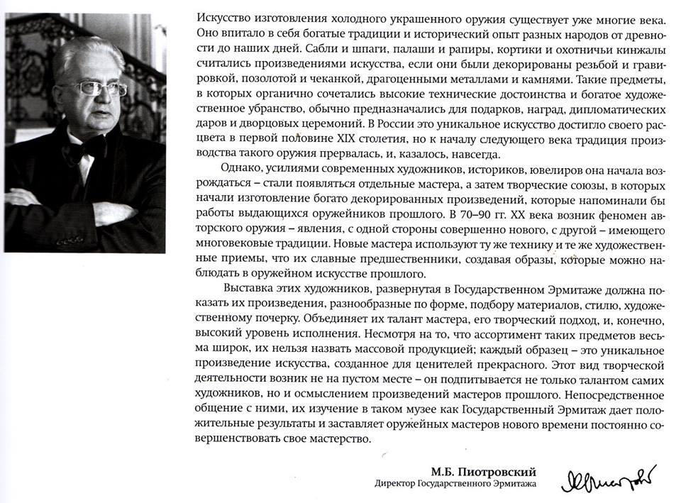 Кураторы выставки – Юрий Георгиевич Ефимов, заведующий Сектором оружия Отдела «Арсенал», и Всеволод Николаевич Образцов, научный сотрудник Отдела «Арсенал» Государственного Эрмитажа.
