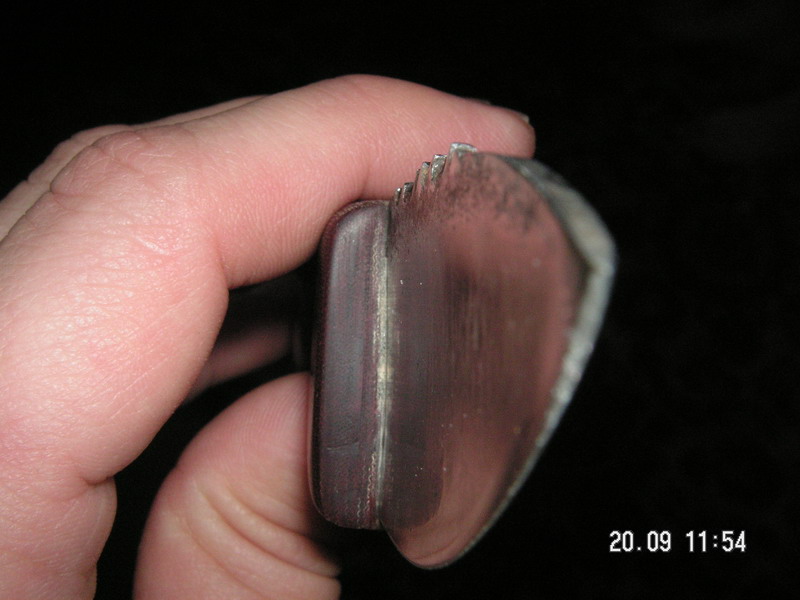 Мужики долго не признавались кто и как сломал мой нож. Кто сломал досих пор не признались, а как рассказали. Расщепляли полено на пополам. Молотком не били. Давили руками. Клинок застрял на половине полена, а потом сломался. Говорят, что гвоздей и сучков не было. С одной стороны нож длинный, тонкий и с широкими вогнутыми спусками, короче не рабочий. С другой стороны, я резал им закуску, резину разной толщины, армированную и неармированную, паранит, резиновые шланги разной толщины, брезентовые рукова, строгал деревянные чёпики, работал ножом как шабером, счищал с труб ржавчину, краску и гудрон. Короче много что делал. Больше двух лет. Вот и думайте сами...