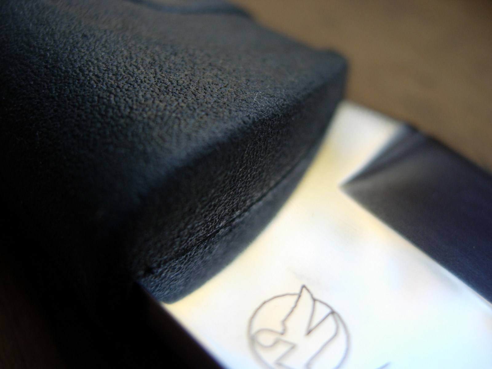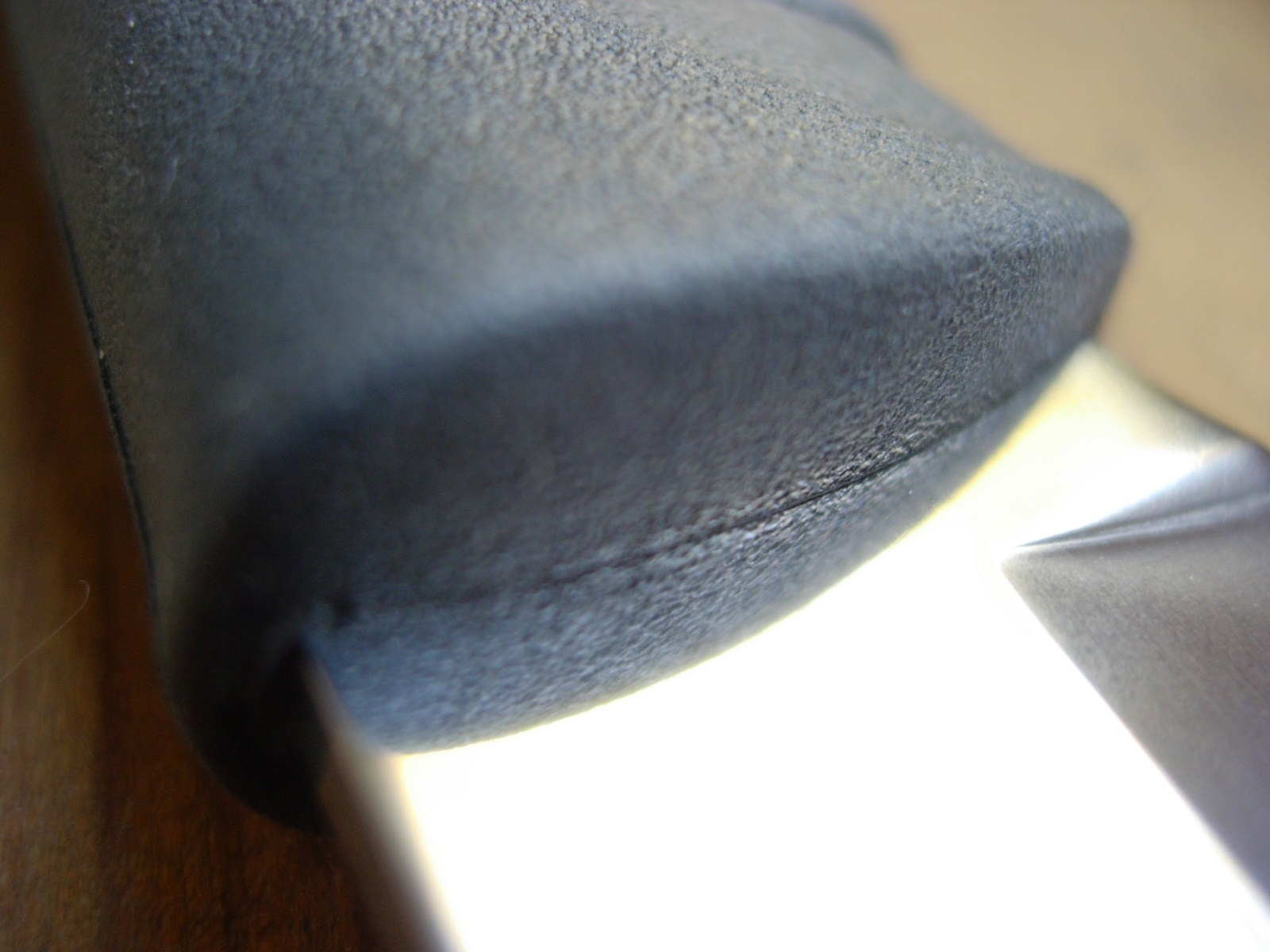 Второе что бросилось в глаза - это ножны. Прислали не пластиковые, а якобы кожанные (что под большим сомнением кстати). Материал ножен больше смахивает на кож-заменитель, ибо ножны тонюсенькие, жидкие как бумага, кожей и в помине не пахнут и структура волокон странная. Возможно конешно я ошибаюсь и это кожа, но если и так, то по сравнению с ножнами от <Т1>, качество кожи значительно хуже. Я встречался по жизни с материалами кож-заменителя высокого качества, по некоторым параметрам даже иногда превосходящих кожу, но тут я в тупике оказался.