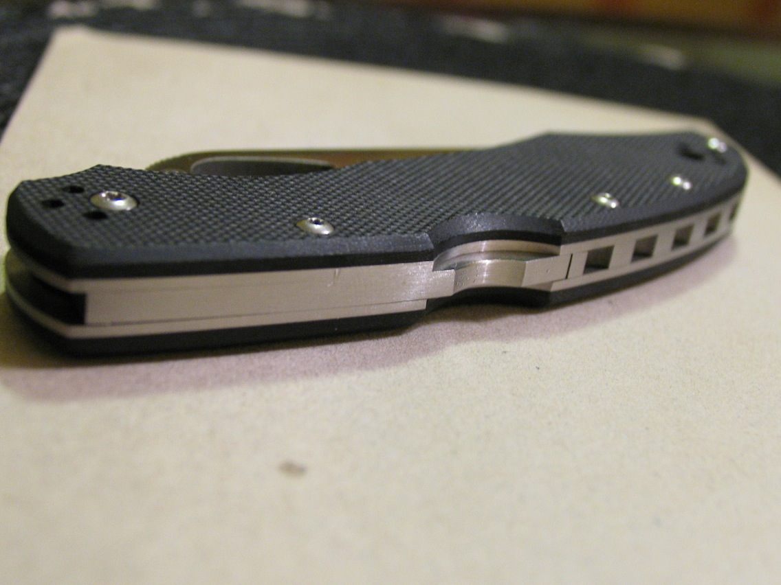 Первым делом я нож полностью разобрал. Кетайцы полирнули его уже смазанным и собранным, поэтому грязи было в механике много. Сняв клинок и шайбы я их протер и смазал маслом для электробритв браун (оч. рекомендую!) почистил замок и смазал его ось. Собрал. Шелк! Так гладко и тихо идет, просто счастье. А в конце громогласный КЛАЦ. Замок надежен, держит хорошо. Люфтов нет. Шайбы металлические, ясен пень. Благодаря отверстию в клинке (которое клинок украшает, а не портит как у спаев) открывается одной рукой в любых ситуациях. Но благодаря тяжелой рукояти можно открыть нож резко тряхнув его держа за клинок. Иногда это удобнее. Закрывать нож тоже можно одной рукой. Делается это в два приема. Сначала отжимаем замок и тряхнув ножом опускам клинок вниз на 90 градусов в курояти. Затем перехватываем нож и убрав пальцы из "зоны поражения" закрываем нож до конца.