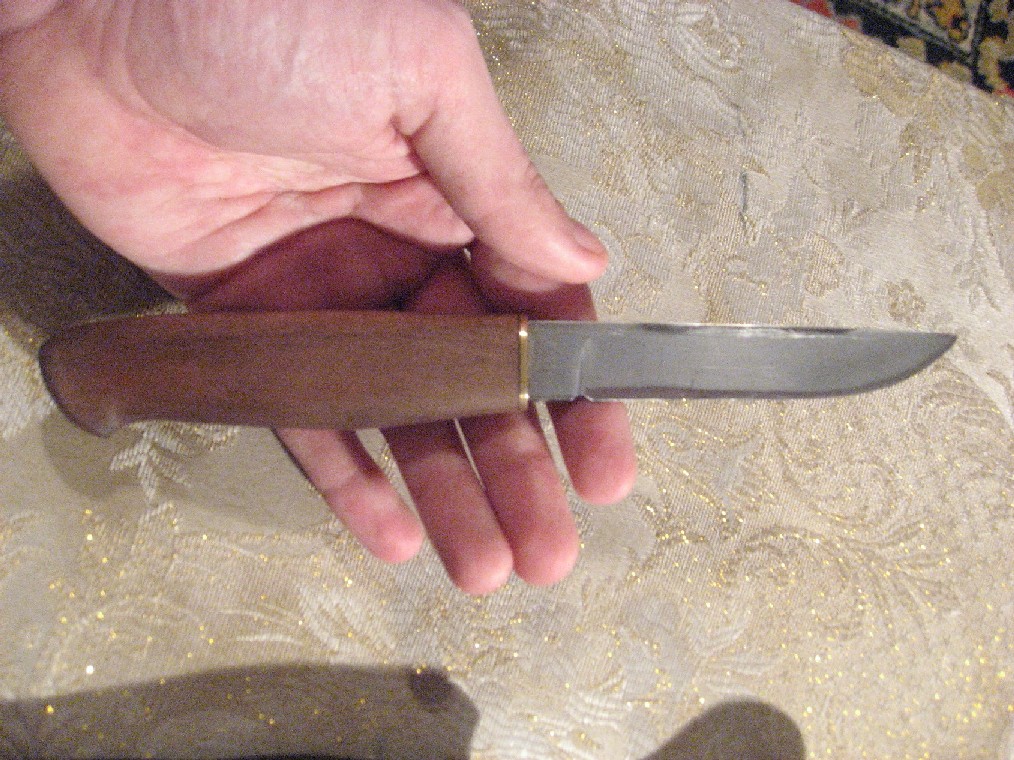 И вот настал долгожданый день, когда нож оказался у меня в руах. Первое впечатление - маленький..... Как это час то бывает когда заказываешь ножи в инет магазинах. Во всяком случае у меня)) Вообще при достаточно толстом обухе 4мм и ширине клинка 18мм он представляет собой довольно прочную конструкцию. Если посмотреть на фото с обуха. то видно, как утоняеться клинок снизу вверх. По форме нож форменая финка))) Спуска, как видно, начинаються почти от обуха. Сами спуски прямые. Интересн был бы вариант с вогнутыми спусками. но увы.. Клинок трехслойка. Внешний слой довольно мягкий - аллюминевый ланский довольно прилично его поцарапал. Внутрений слоой естественно тверже и темнее. Про твердость и рез ничего плохого сказать немогу - резал мясо, курицу на кухне, все довольно пристойно, без нареканий.