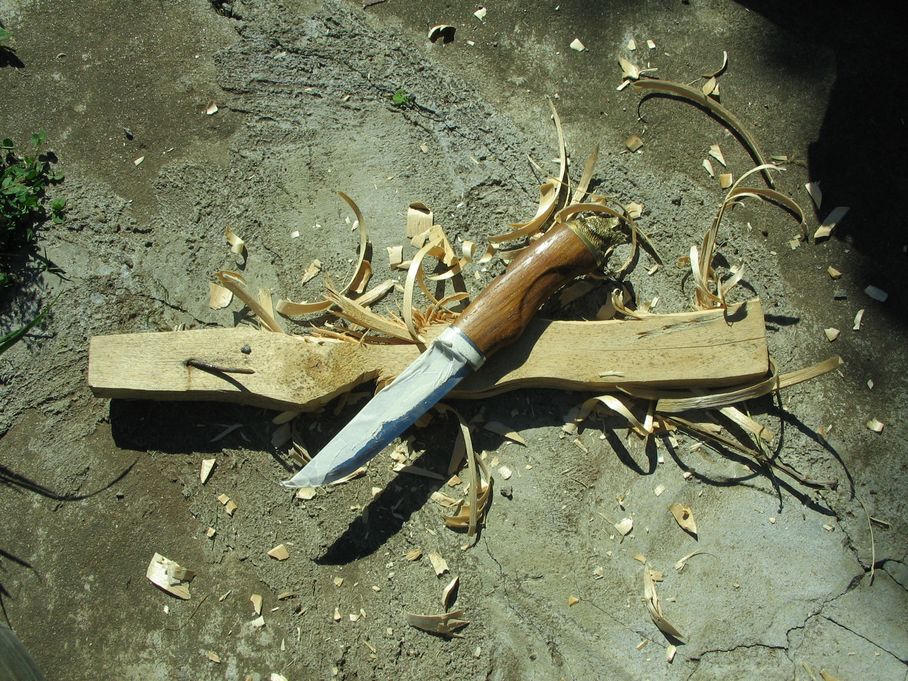 В качестве тестируемого материала взял старый траченый мышами рог лося. Клинок строгал рог очень хорошо. И после строгания даже умудрялся резать тетрадный лист.