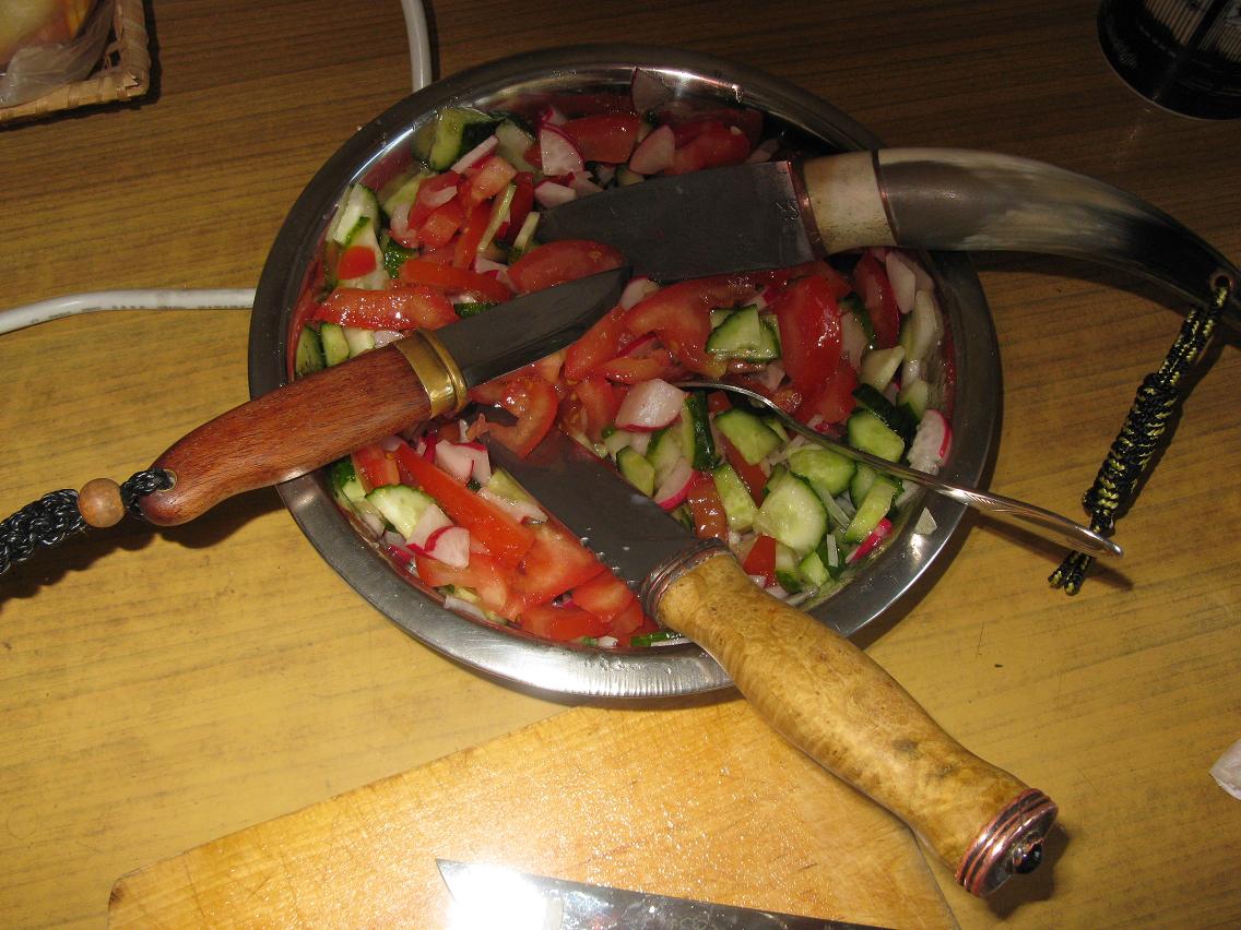 Нож понравился еще на фотографии. До сих пор считаю, что с аукционом мне повезло и цена получилась довольно-таки смешной. Когда взял в руки, нож понравился еще больше. В руке лежит изумительно. Правда, медная проставка между рогами оказалась сверху и с боков чуть шире, чем лосиный рог, поэтому палец непроизвольно за нее цепляется — в работе не мешает, но как-то все-таки... Были сомнения в комфортности ножен при ношении, поскольку петля подвеса пришита довольно жестко к задней стороне ножен и имелась вероятность, что нижний край ножен при ходьбе будет втыкаться в бедро, но оказалось, что ширина петли позволяет чуть повернуть ножны под углом и избежать такой проблемы. Вообще ножны здорово формованы под нож и можно трясти их хоть до второго пришествия, но нож не выпадет, правда каждый раз, вынимая нож, приходится счищать с РК мелкие крошки кожи, которые он потихоньку соскабливает. На кухне обнаружилось, что «Бычком» очень удобно резать овощи и мясо — не толстый клинок, отличная заточка плюс загнутая книзу, по сути пистолетная, рукоять, удобно лежащая в руке. Правда для постоянного использования на кухне клинок все же коротковат, да и не планировался он для домашней он для кухни. Вот как-то так по «Бычку» (резку мяса не фотографировал — не хотелось запачкать жиром фотоаппарат).