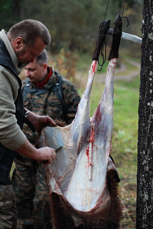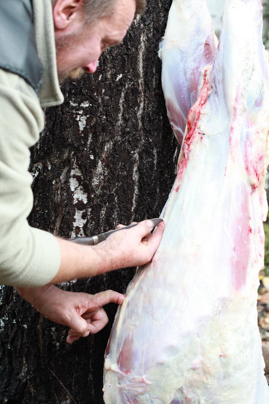 Далее, для удобства разделки, тушу подвесили на паракорде за задние лапы и начался процесс свежевания (снятия шкуры). Перед непосредственным снятием шкуры надо сделать кольцевые надрезы на ногах в районе коленного сустава. Операция для ножа не простая, ведь фактически шкура разрезается на костях и сухожилиях. Нож справился с этим достойно, без повреждений РК.