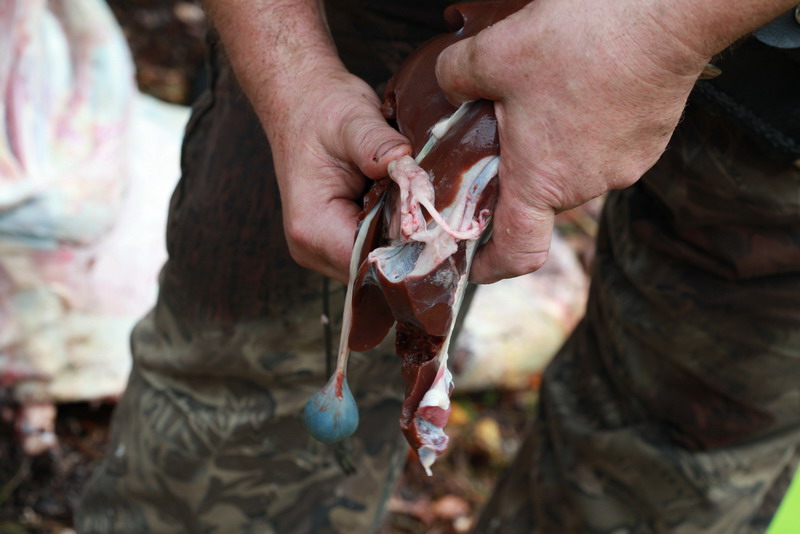 Все не съедобные внутренности были выброшены, с печени надо было аккуратно срезать мешочек с желчью. Удобнее всего эту операцию проводить кончиком ножа, но т.к. Кончик у нас был обломан и подзатуплен, то сделать это получилось не сразу, но нож, и будучи покалеченным, с этим справился, но резали другой частью клинка(менее удобно).