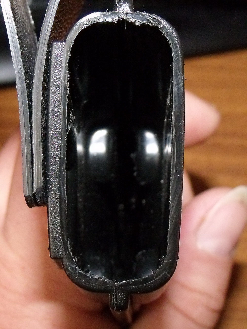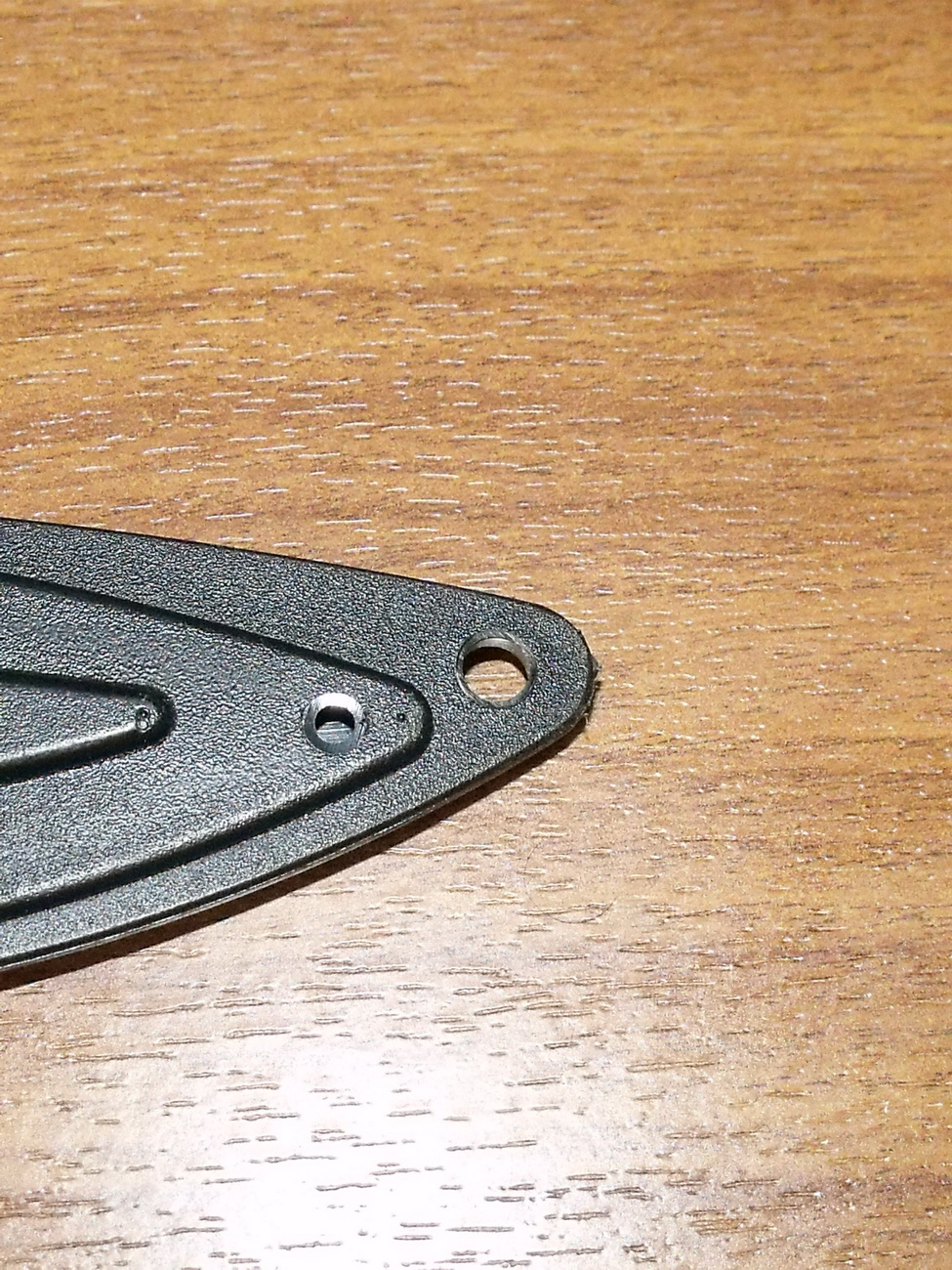 На конце ножны имеют два отверстия. Одно-сквозное, скорее всего, для монтажа паракорда, призванного обеспечить дополнительную фиксацию ножен к ноге, второе-для отвода воды, попавшей в ножны. Отверстия выполнены аккуратно, с зенковкой