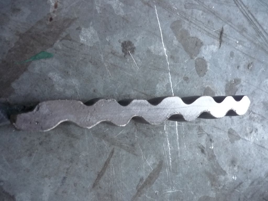 У нас это волчий зуб называют ,но принцип тотже.Чтобы треугольники были ровные,выборку делаю четырехгранным напильником а края закругляю,протягиватьлучше молотком с полукруглым бойком и сглаженными гранями(чтобы избежать пробоев,это то что кованиной называют),толщину заготовки лучше брать побольше(5-7мм),обух на заготовке,перед нарезом зуба,полукругом заваливаю к РК(РК прямая) при вытягивании спусков обух выпрямится а РК изогнется как надо и рисунок будет ровнее