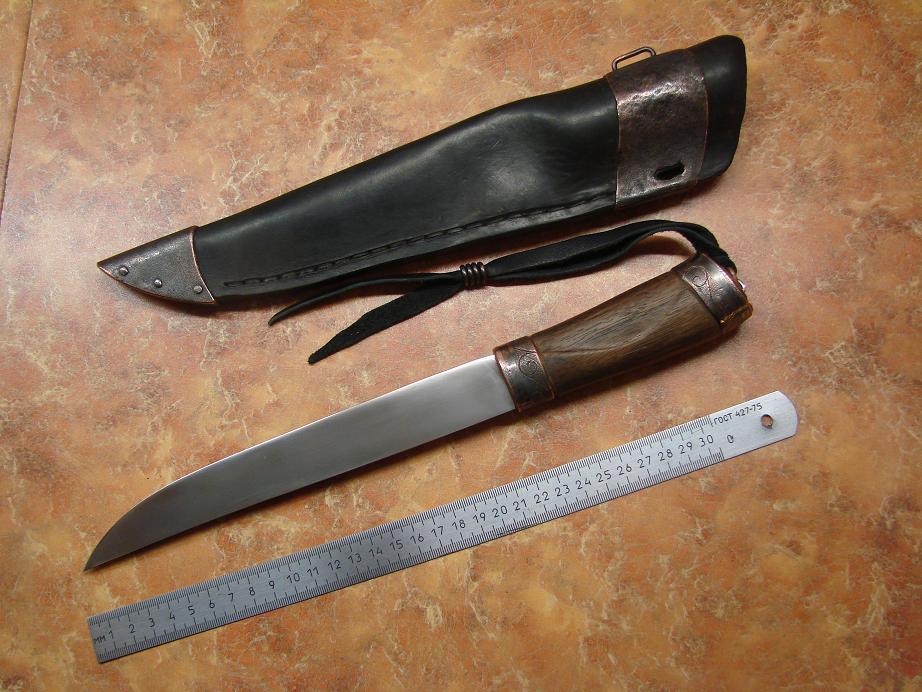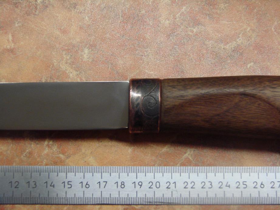 гдето так,нож на работе точнее не скажу :wink: но длину на 3 см уже уменьшил :D завтра ножны доделаю и сфоткаю с линейкой