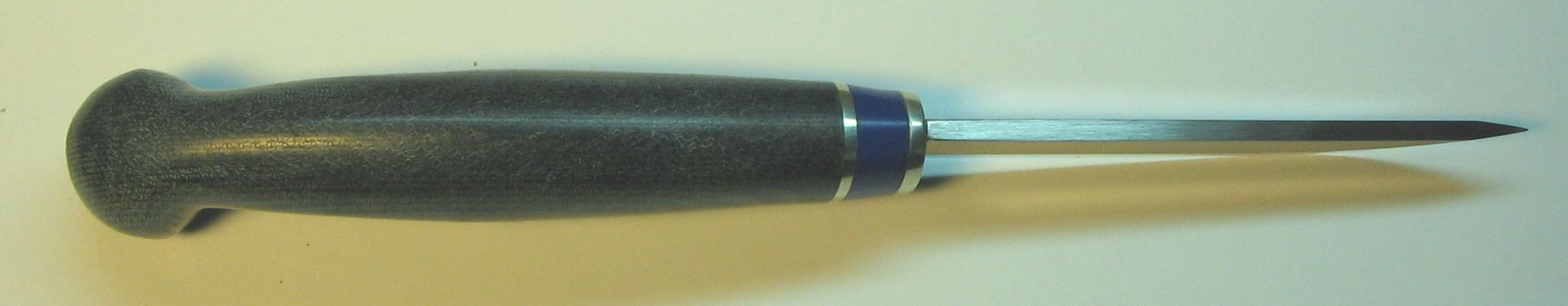 Я еще не делал ножикофф с клинком Лаури. И вот решил восполнить пробел - одеть клинок в самопальную микарту. Нарезал джинсы полосками. Но не стал наматывать их, а действовал испытанным способом - сложил стопкой. Получилось 32 слоя. Намазал, сжал и когда проклеилось осталось только убрать лишнее. Получилась финочка не боящаяся воды. :)