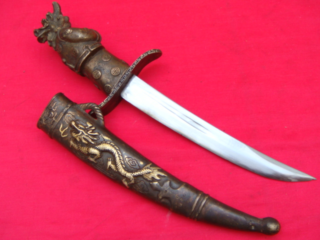 Однажды видел интересную вещицу. Два ножика с рукоятями в виде драконов, целиком, от хвоста до носа. Основной прикол в том что каждая рукоятка одновременно является ножнами, в которые вставляется клинок другого ножа. В конечном итоге получаем вовсе не агрессивную интерьерную поделку, стоящую на комоде, в виде двух целующихся (или типа того) драконов. Клинки естественно из кастрюльной китайской Stainless, рукоятки - пластик, но сама идея очень зацепила, весьма оригинальное исполнение.