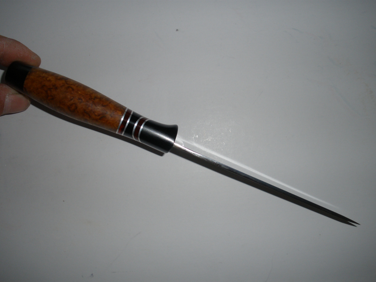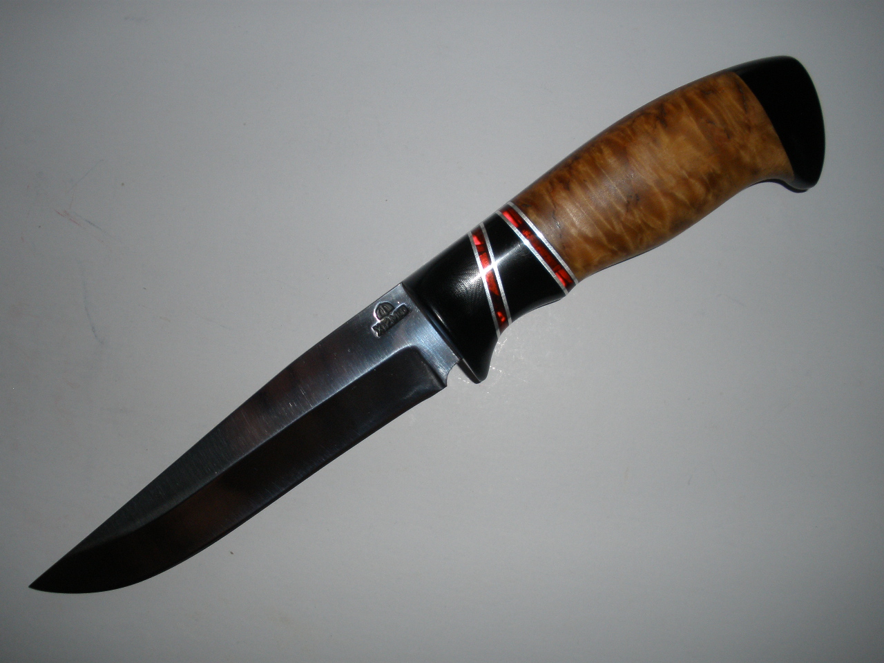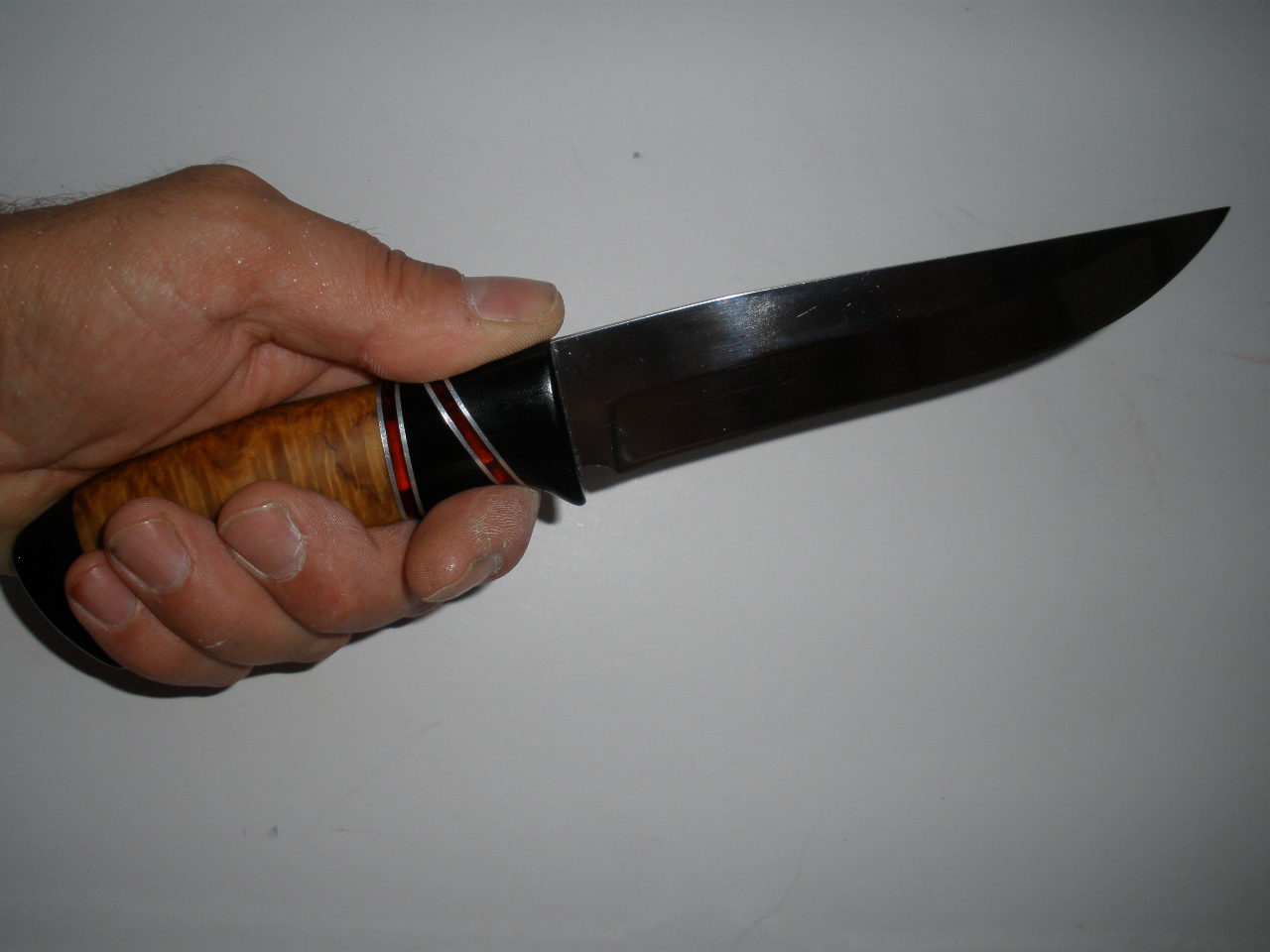 Приветствую уважаемых кнайфлайфинцев .Подумалось мне что с кухняриками и якутами можно повременить,и смастрячил вот такой ножевичёк.Всё в пределах допустимого,толщина клинка 2,4 мм ,остальные размеры видно на фотах.Материалы : клинок х12мф от Мастерской Федотова,слегка послесаренный мной,рукоять - микарта (больстер и тыльник),и карелка,в проставках оргстекло с белым металлом.Монтаж всадной на ЭДП,и тыльник тоже.Ножны будут местного производства,из бюджетных .Ну ,а на вопрос ,почему ,,Бандитовский,,- отвечу ,дык там жеж красные прослойки ,а-ля финка.Но никак не отпускает разработка бокового упора ,теперь совместил ея с обычным нижним подпальцевым упором.Смотрим,ну и ессно критикуем поделку.